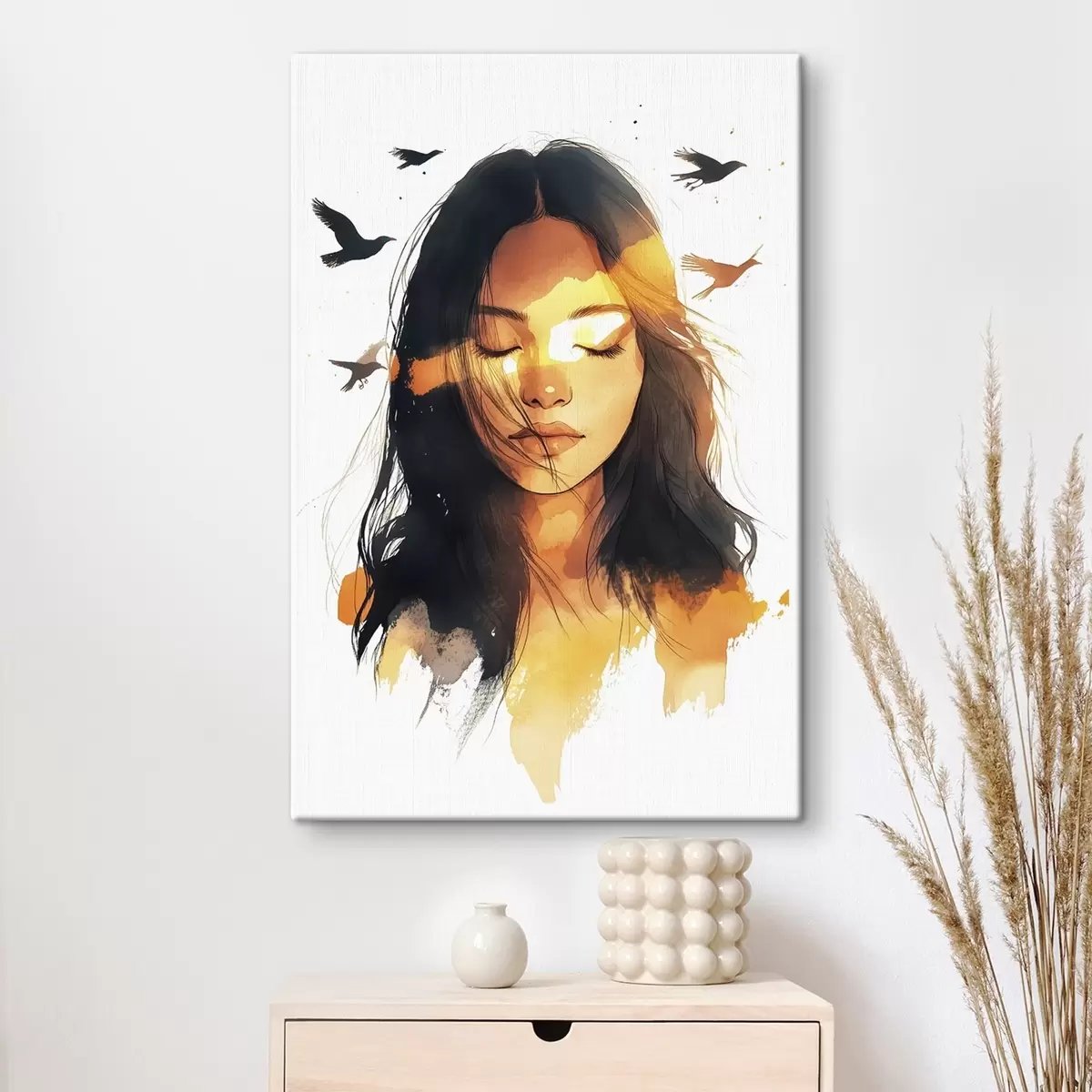 Картина Акварельний портрет, красива дівчина, сонячне світло, птахи, що летять s42198