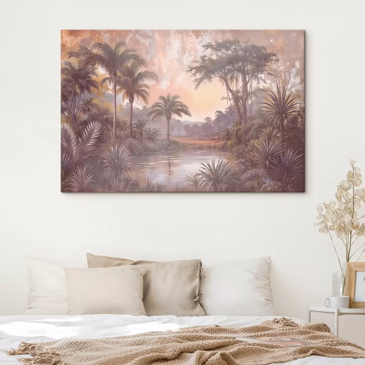 Картина Тропічний фактурний пейзаж з безтурботним озером, оточеним пишними пальмами та іншим листям Арт. s42219