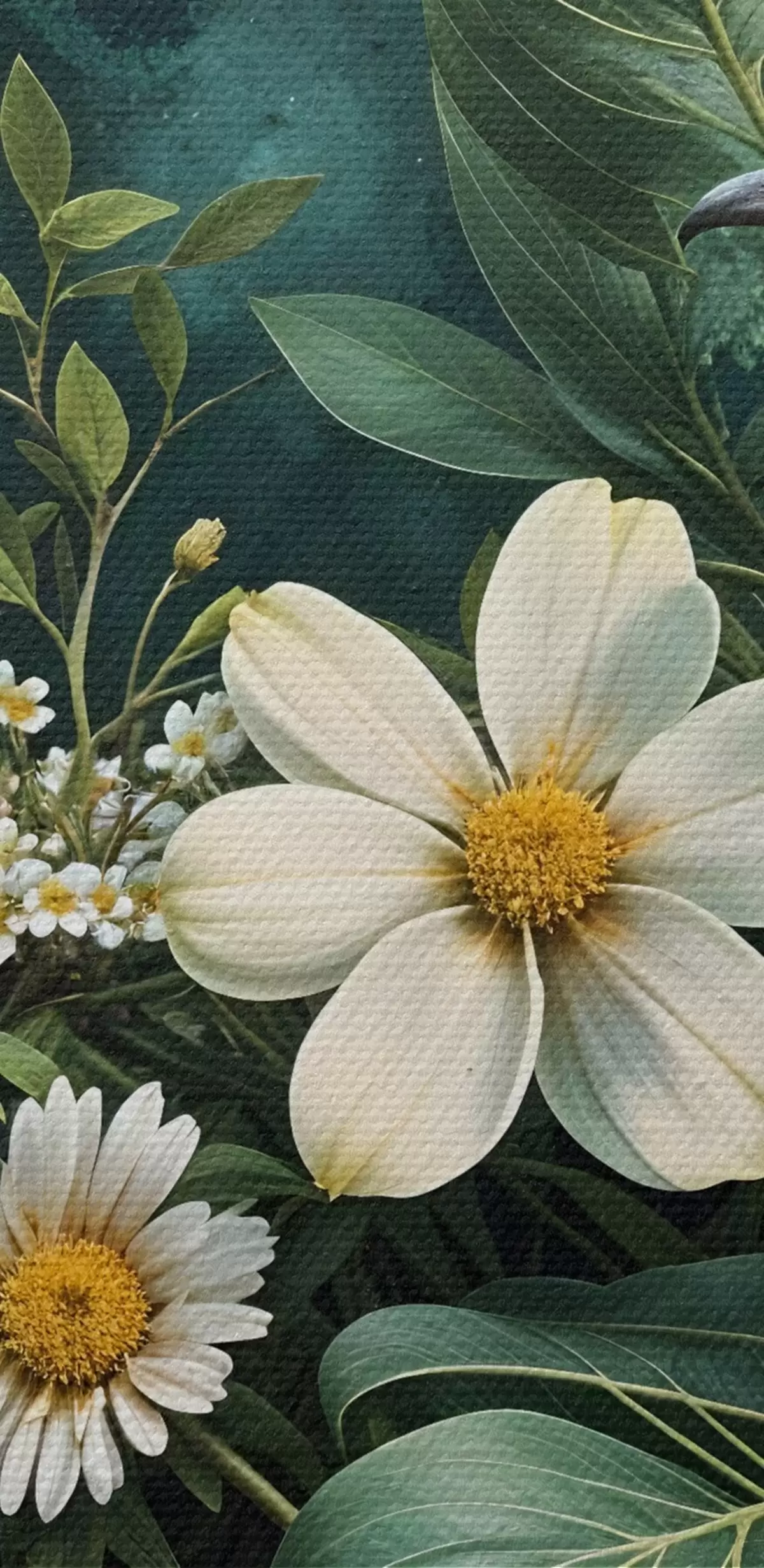 Картина Маленькі пташки сиділи на гілках в оточенні пишного тропічного листя, включаючи велике зелене листя і різнокольорові квіти Арт. s42220