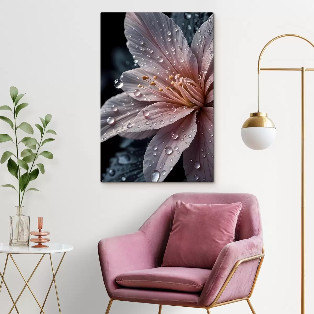 Картина Крупним планом рожева квітка з ніжними пелюстками, вкритими крапельками води, на темному тлі Арт. s42237