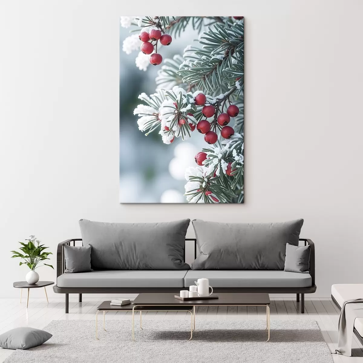 Картина Засніжена гілка сосни з червоними ягодами, зимова сцена Арт. s42238