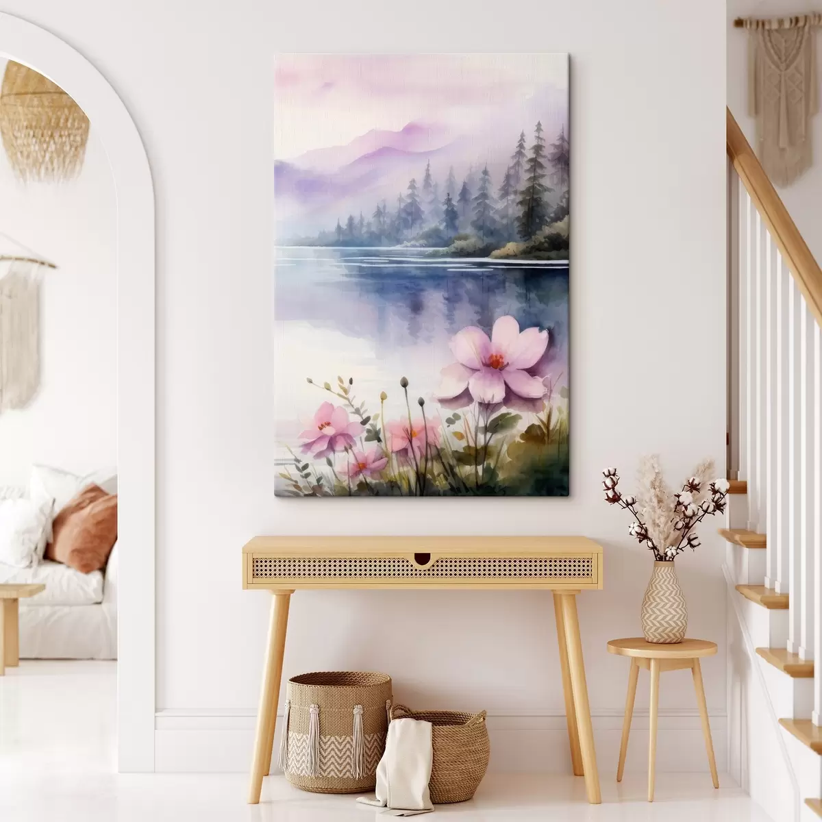 Картина Рожеві квіти на тлі озера в горах Арт. s42393