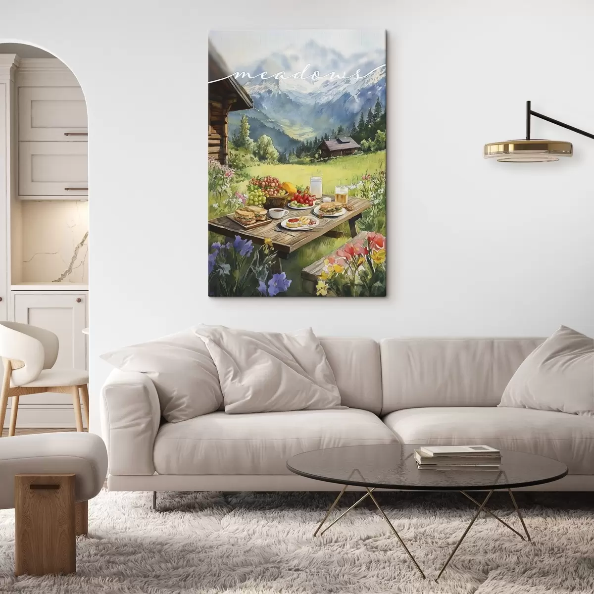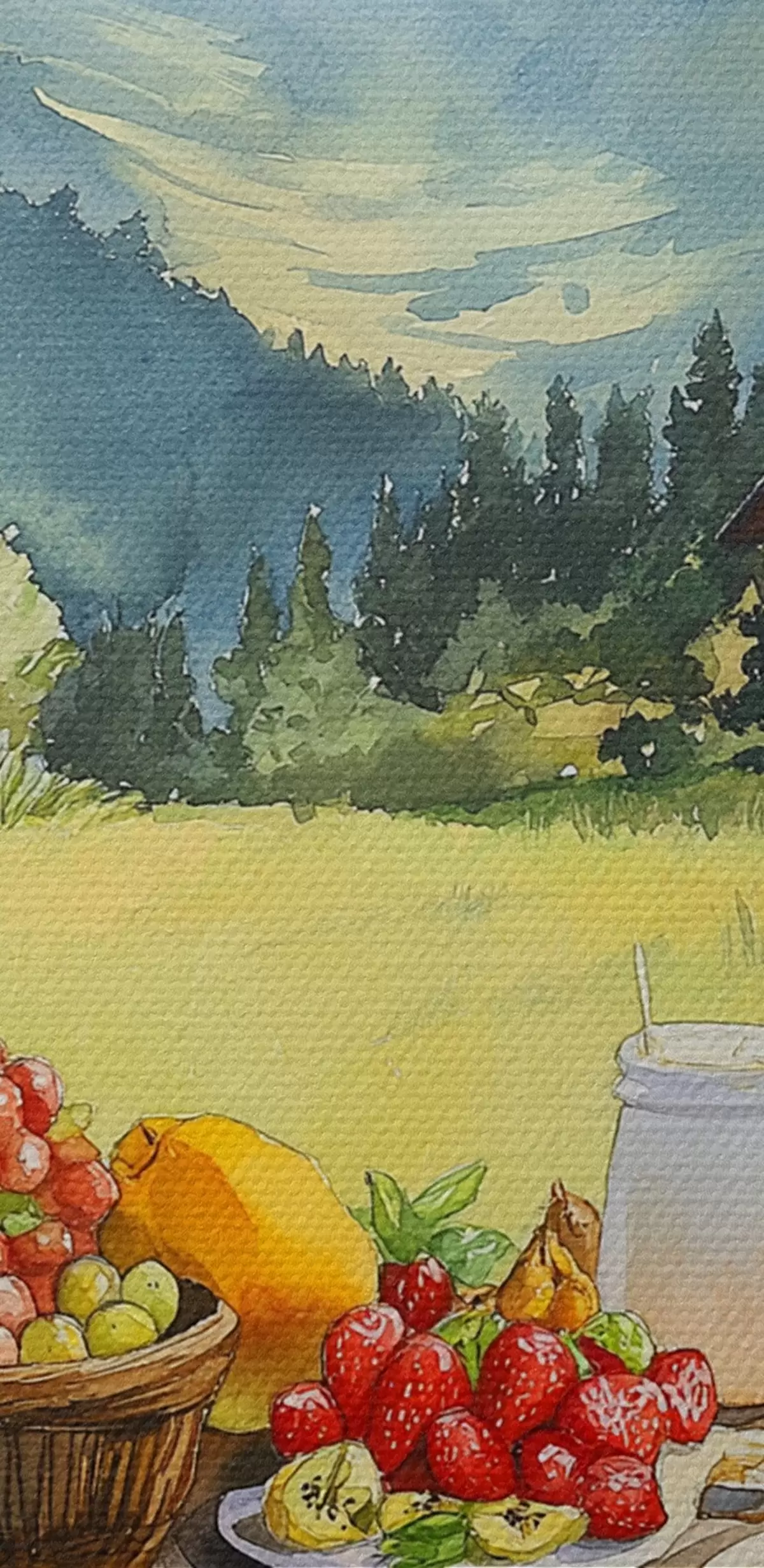Картина Гірські пейзажі, літня галявина, лісові будиночки, сніданок Арт. s42425