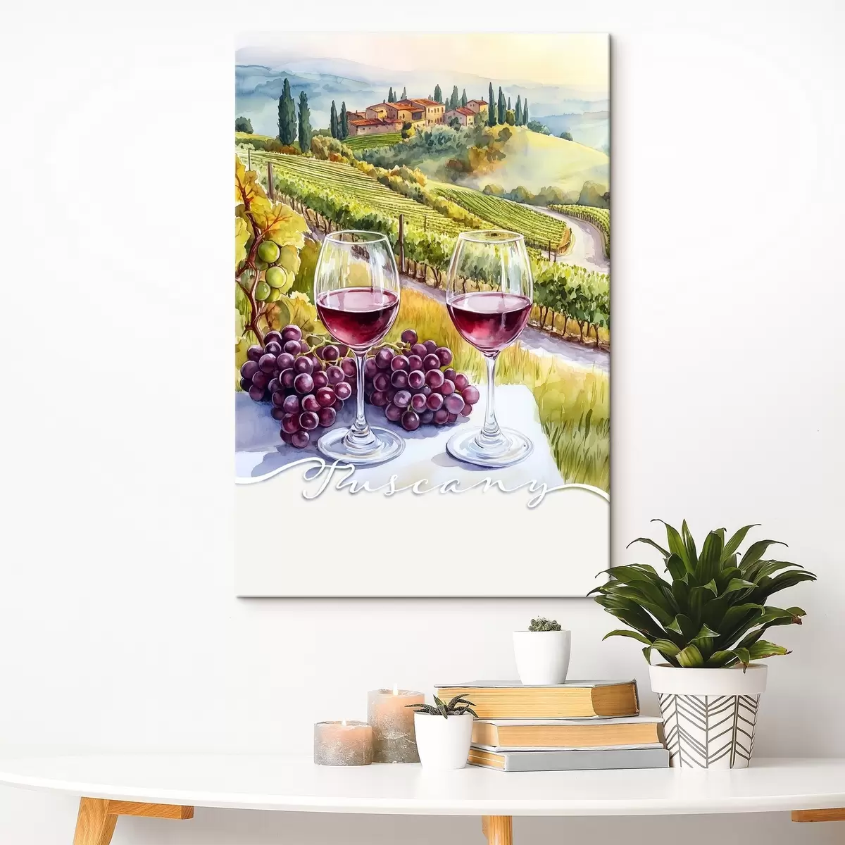 Картина Пейзажі Тоскани, акварельний стиль, келихи, виноград, захід сонця Арт. s42439