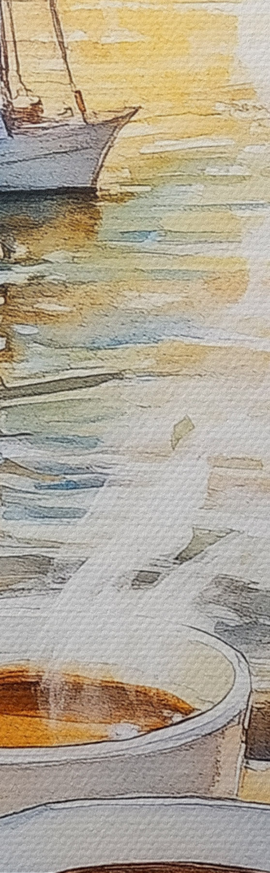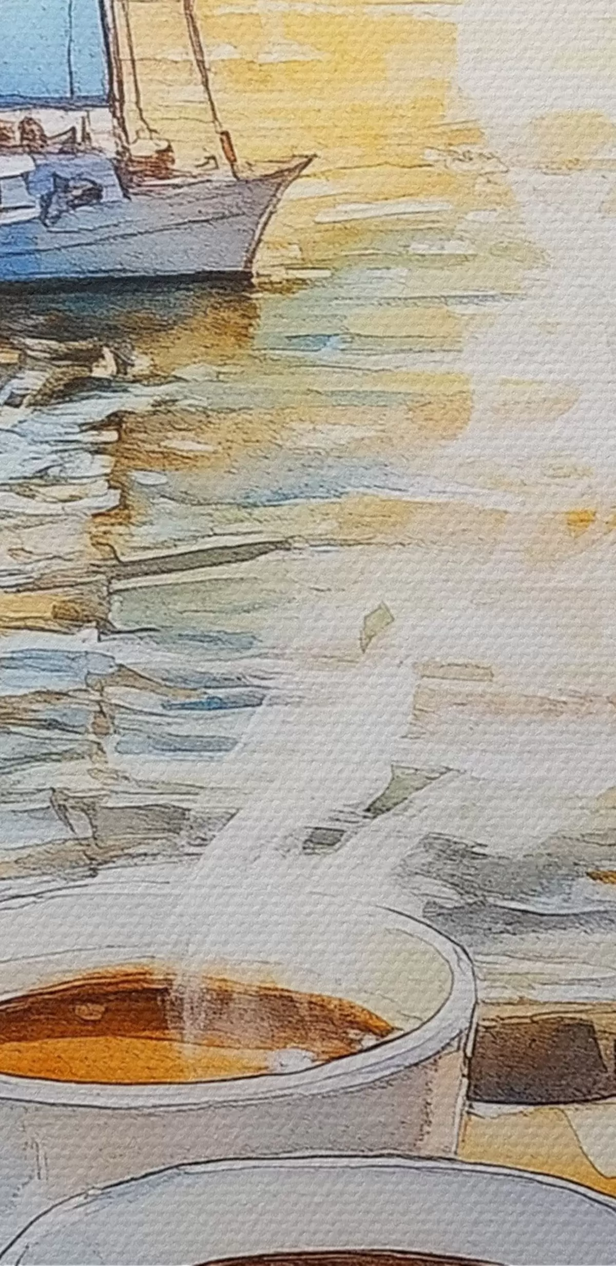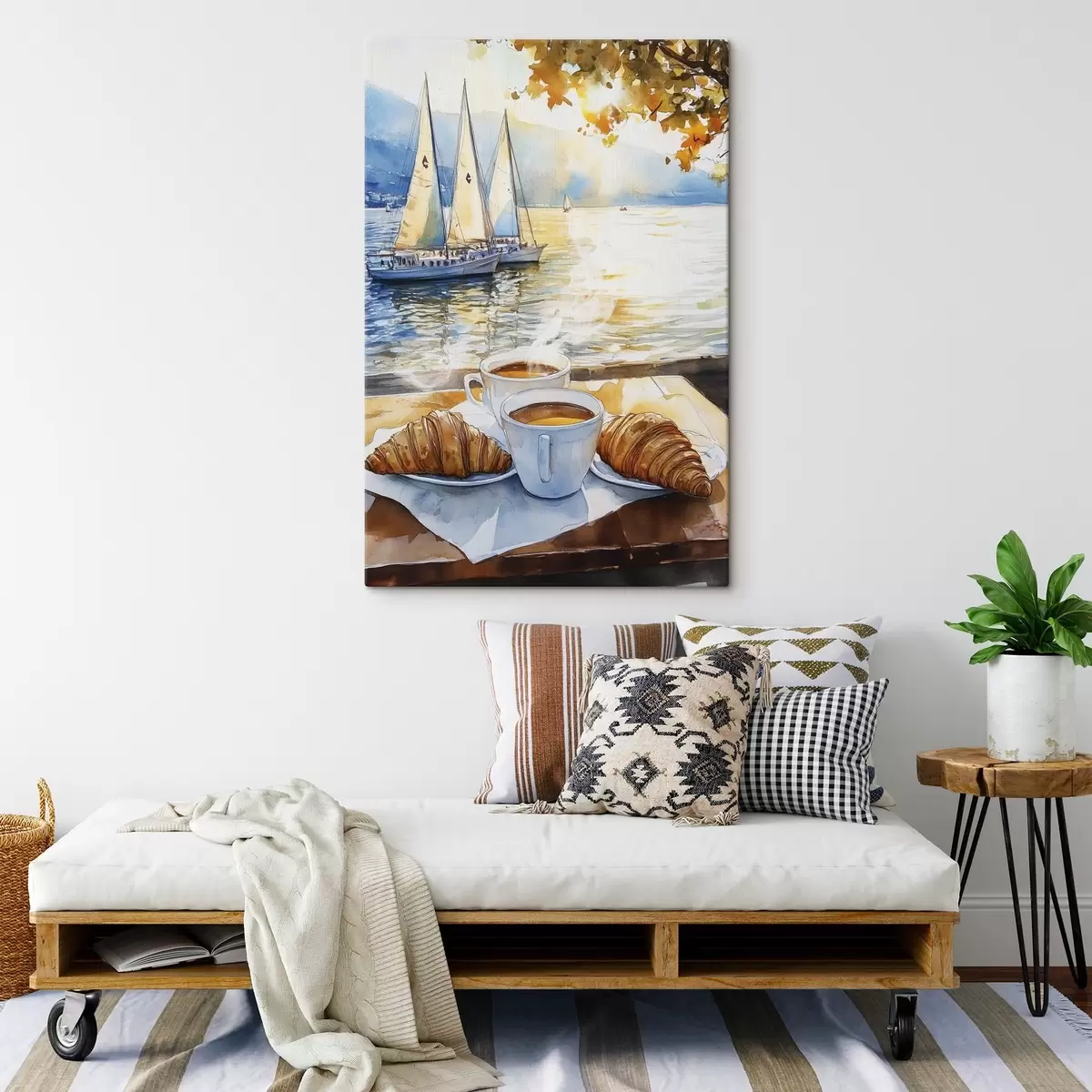 Картина Філіжанка кави, кольори заходу сонця, озеро, вітрильники, природа, подорожі Арт. s42443