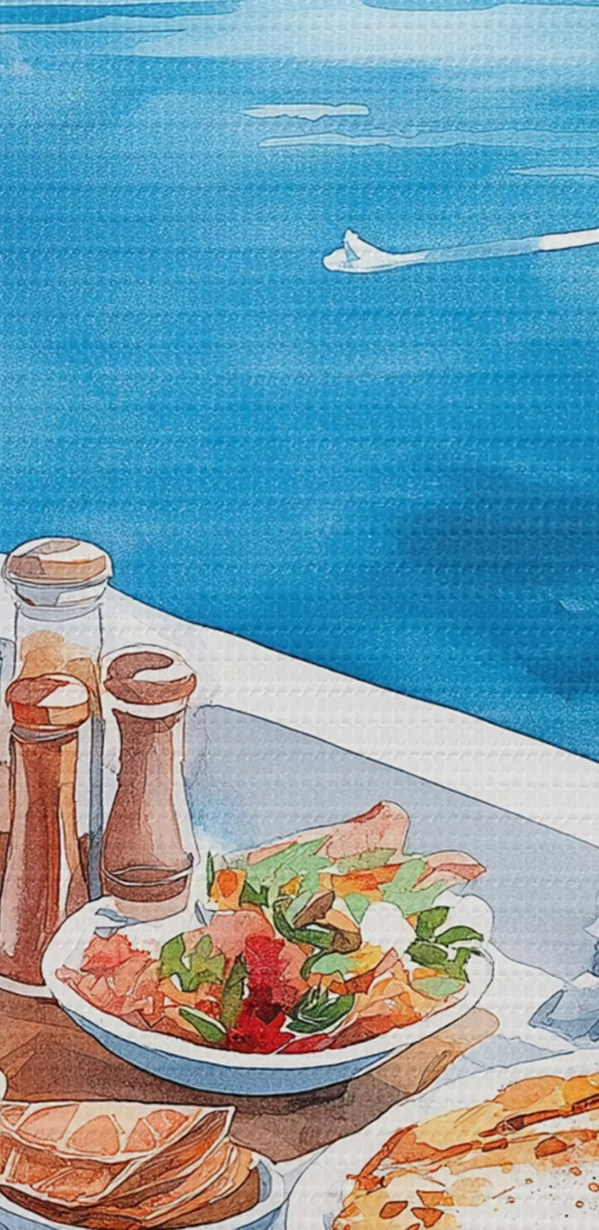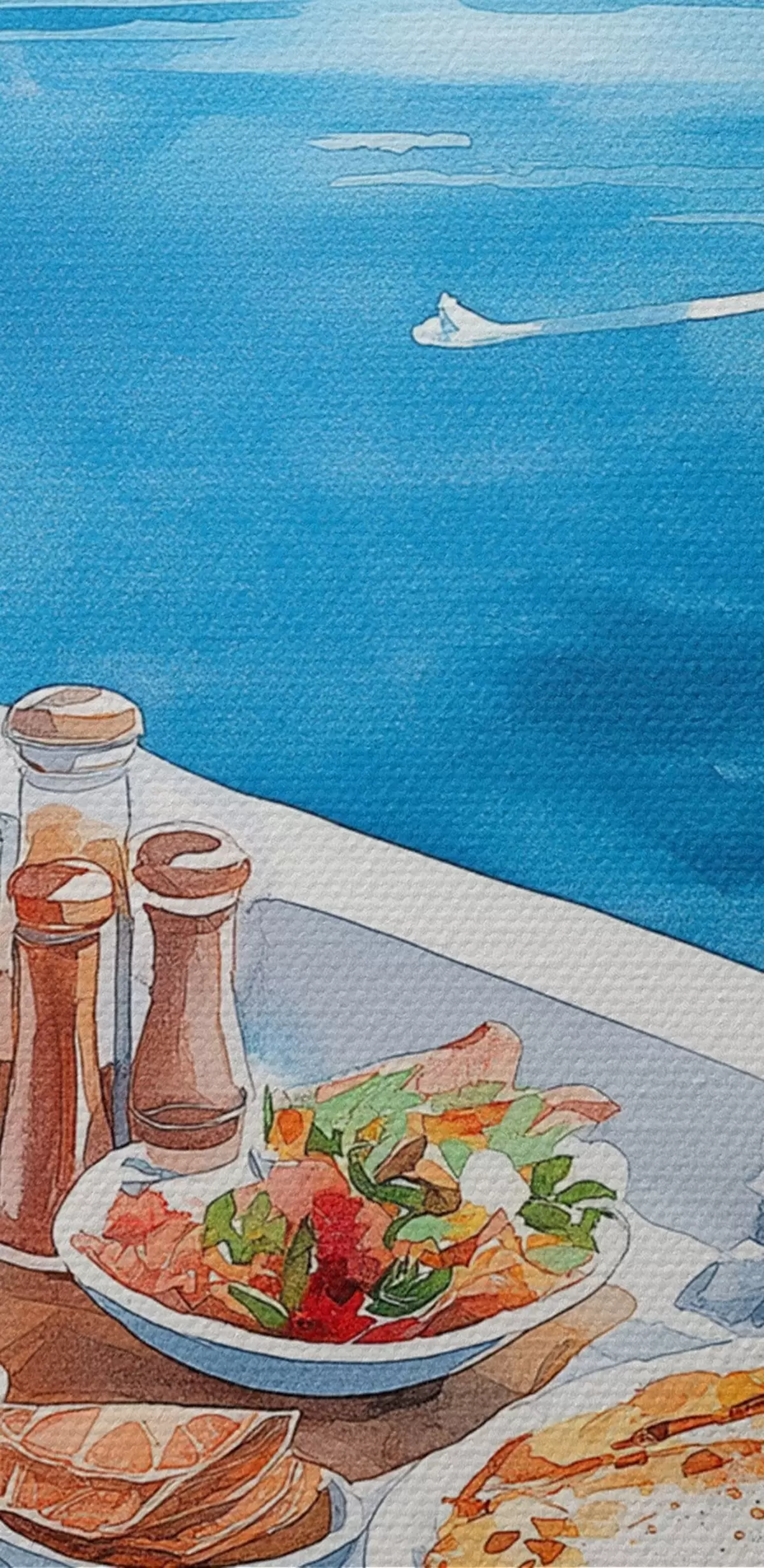 Картина Прекрасний романтичний сніданок у Греції, море, акварельний стиль s42455