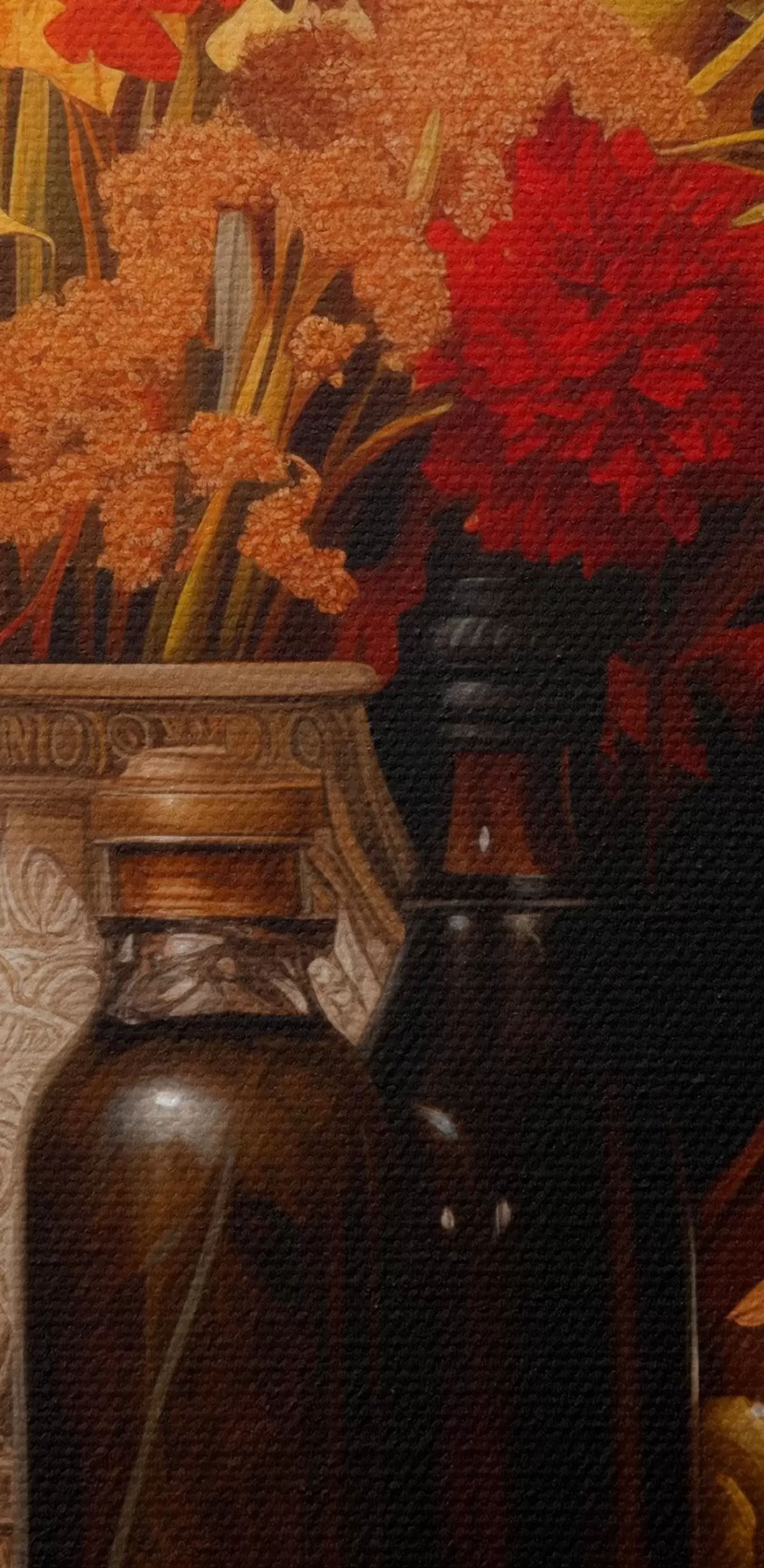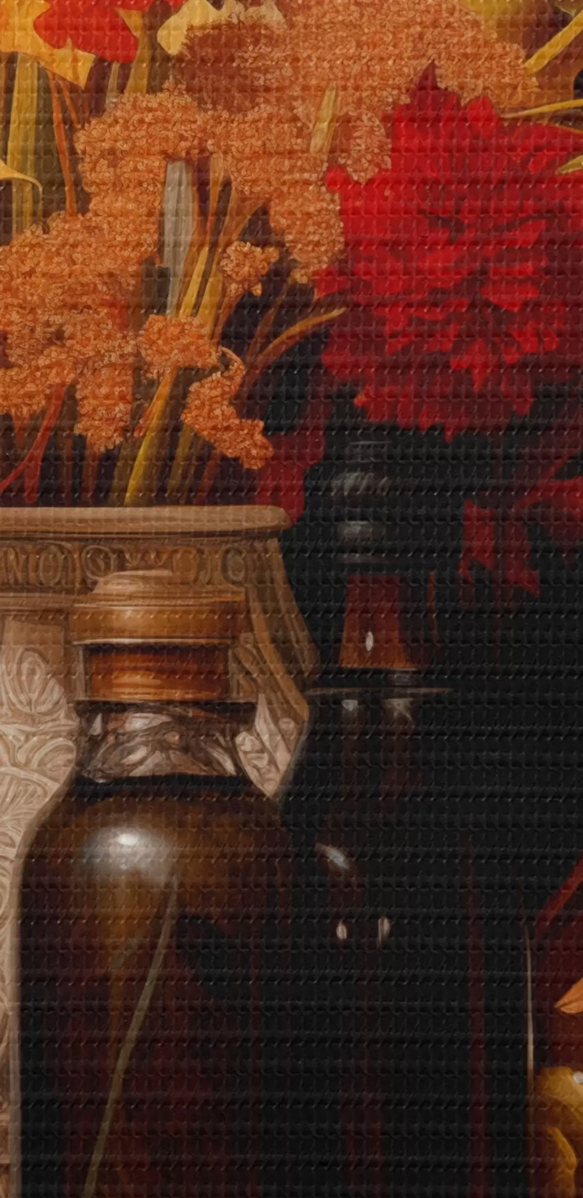 Картина Осінній натюрморт з букетом у теплих помаранчевих і червоних тонах, яблуками, виноградом, книжками та керамічним посудом на темному тлі. s42561