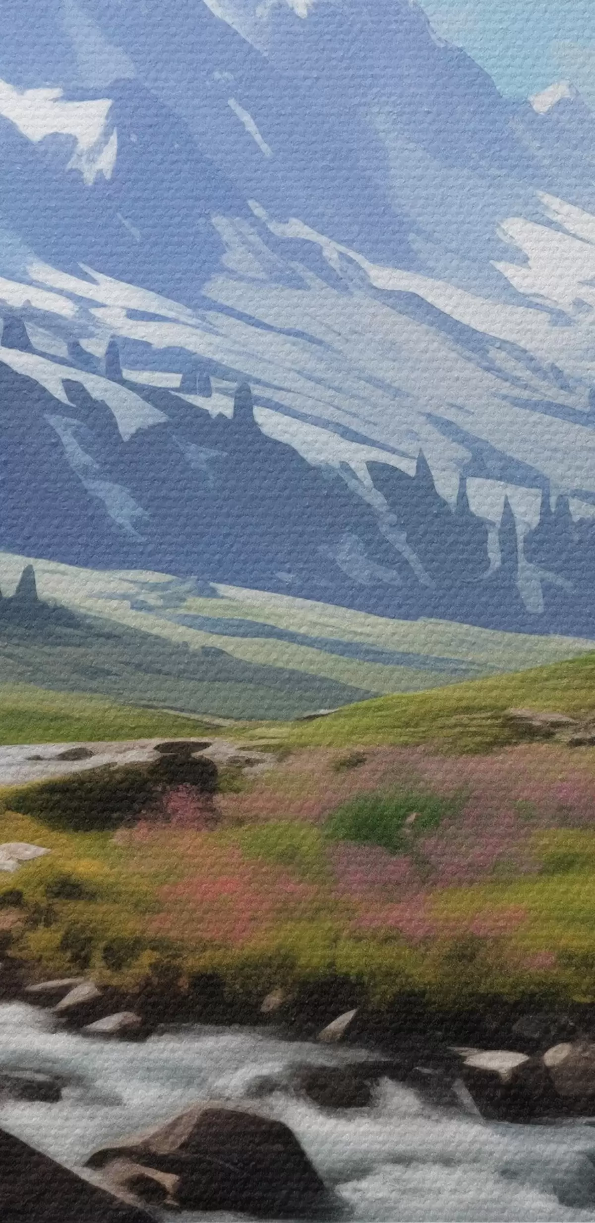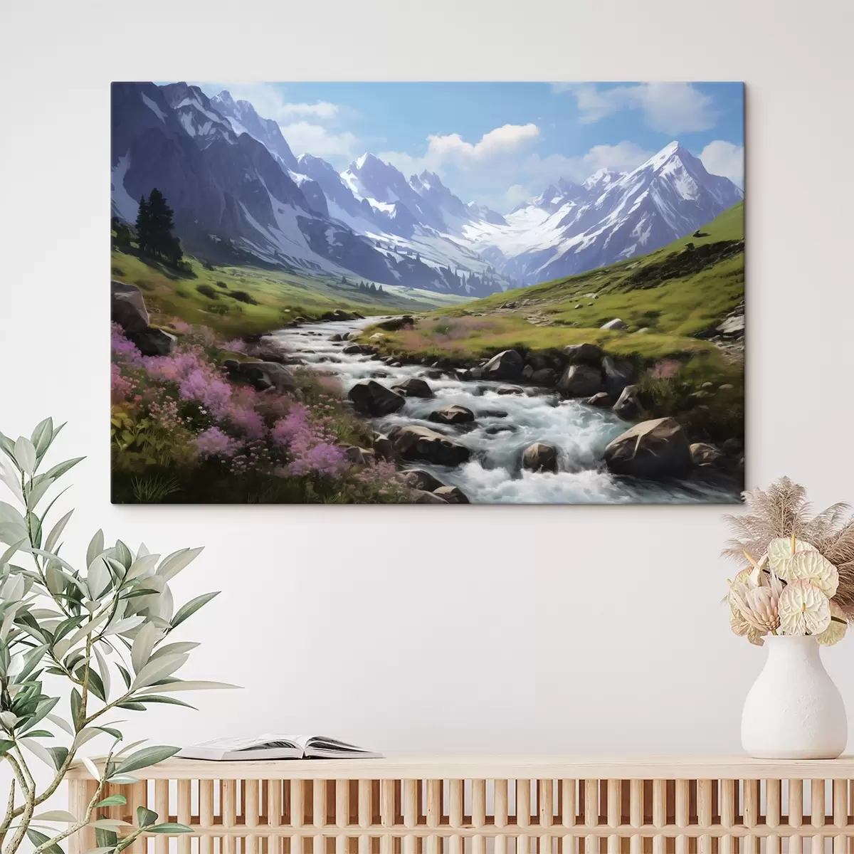 Картина Гірський пейзаж з бурхливим потоком, квітучими луками та засніженими вершинами на горизонті під яскраво-синім небом. Арт. s42563