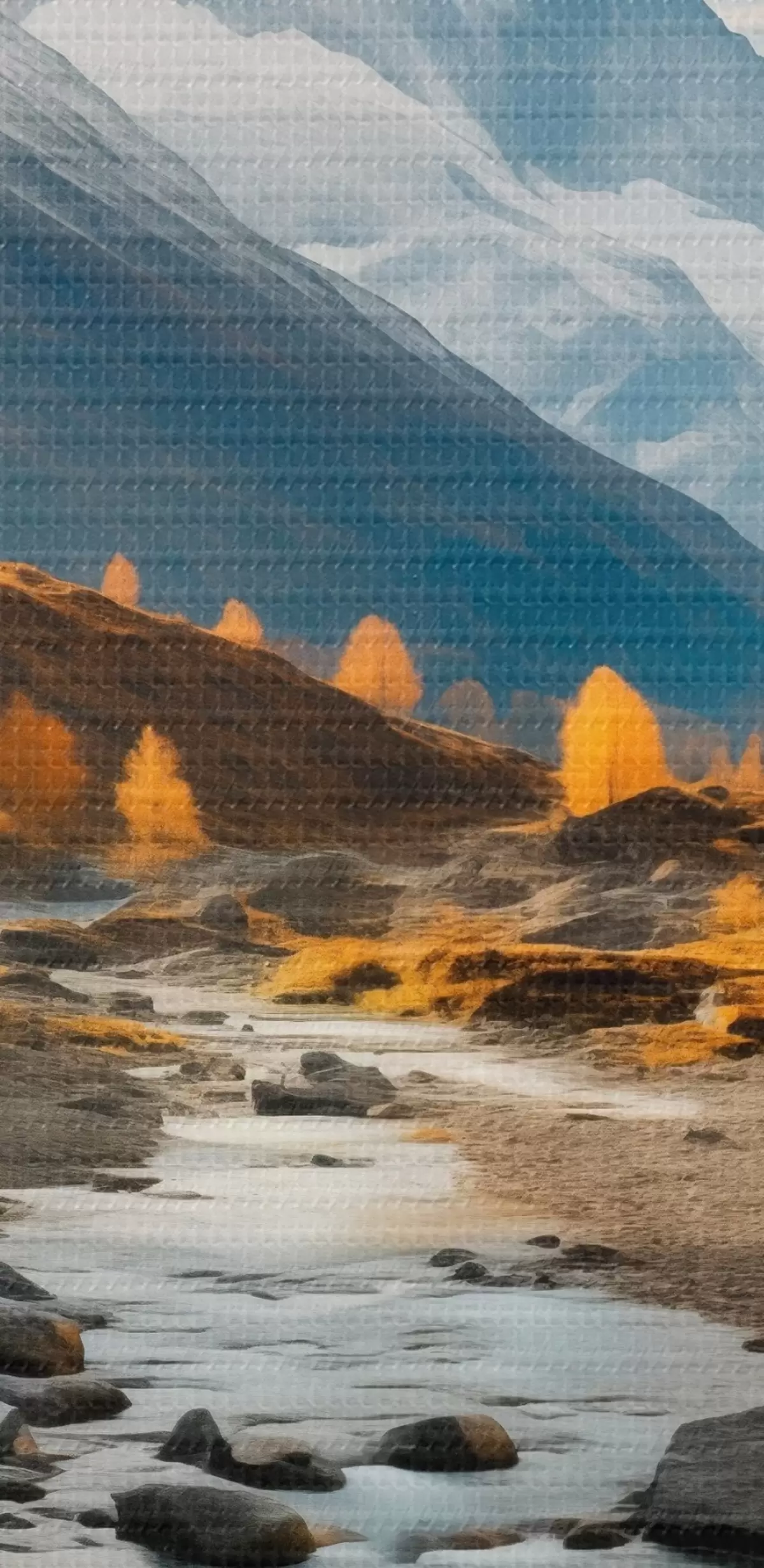 Картина Осінній гірський пейзаж з бурхливою річкою, деревами та величною вершиною на тлі ясного неба. Арт. s42564