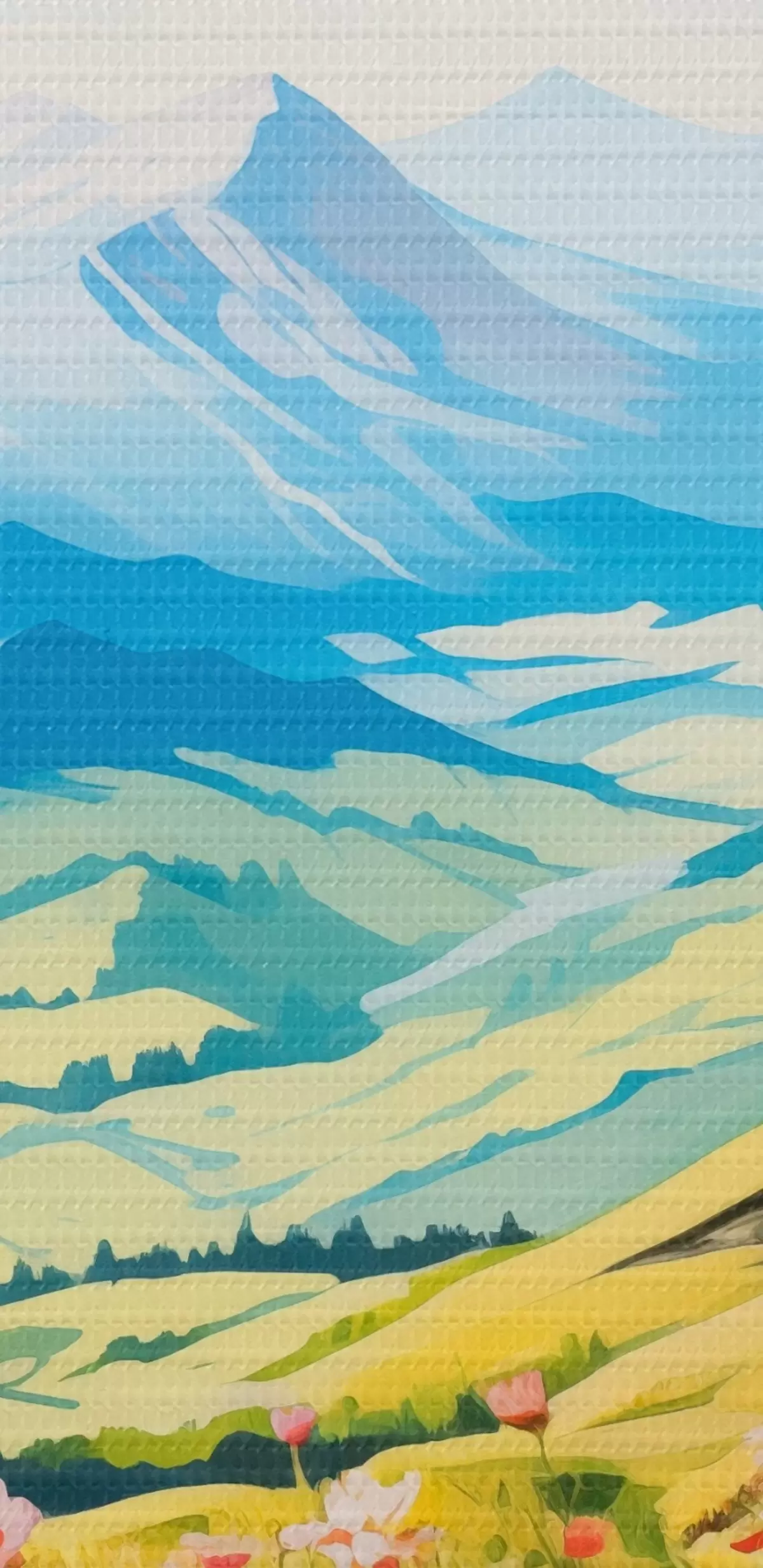 Картина Яскравий гірський пейзаж з квітучими луками, зеленими пагорбами та величними вершинами під чистим блакитним небом. Арт. s42565