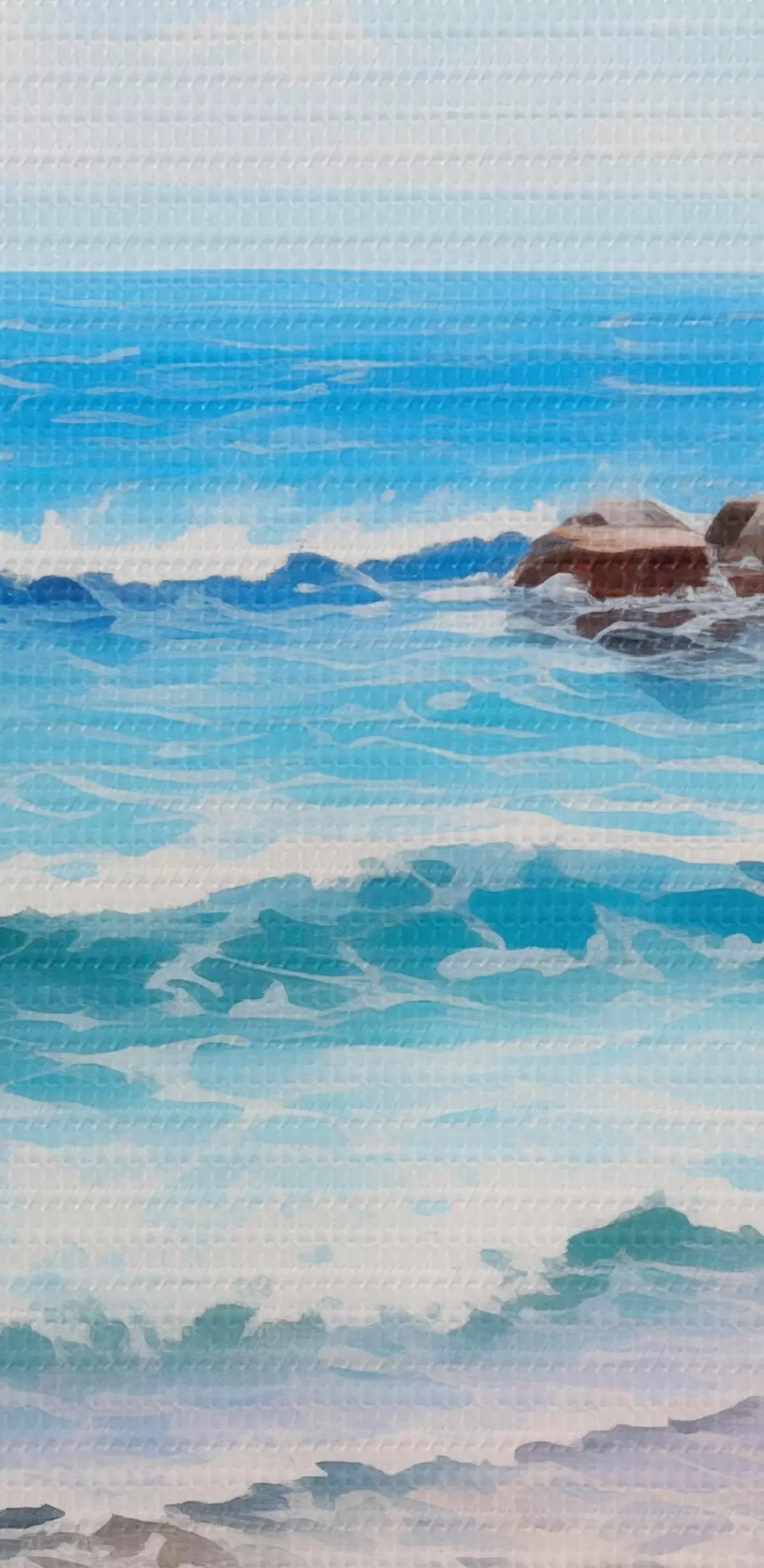Картина Морський пейзаж з бірюзовими хвилями, гальковим пляжем і ніжними рожевими квітами на передньому плані під яскравим небом. s42569