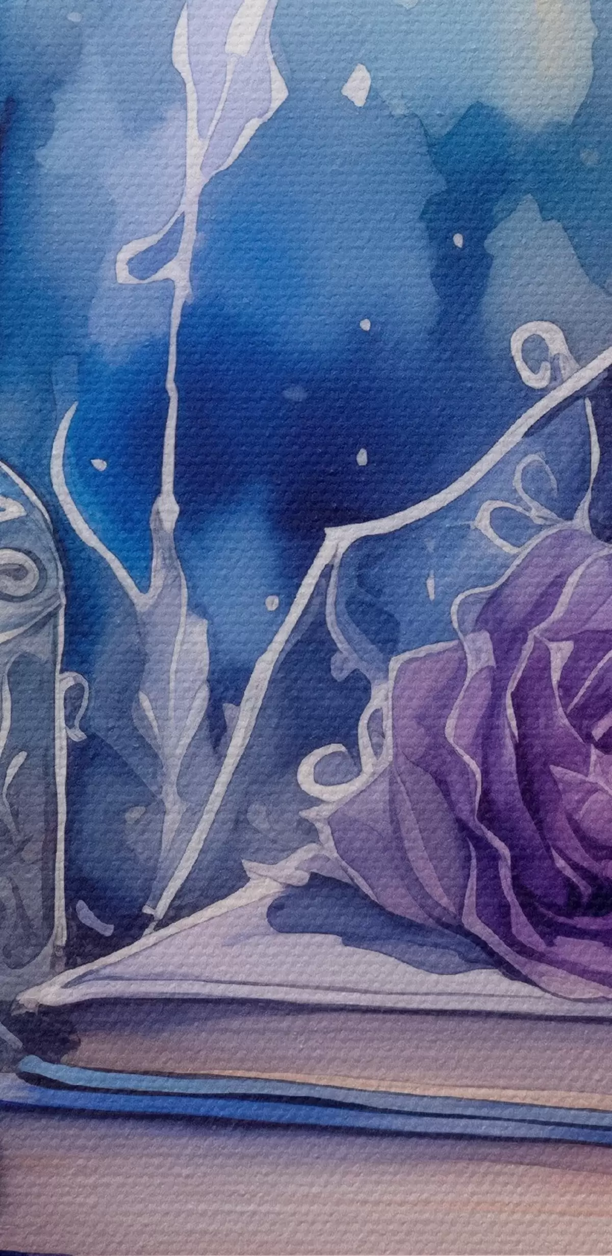 Картина Натюрморт з вінтажними книжками, скляними пляшками в синьо-фіолетових тонах та декоративними квітами. Арт. s42574