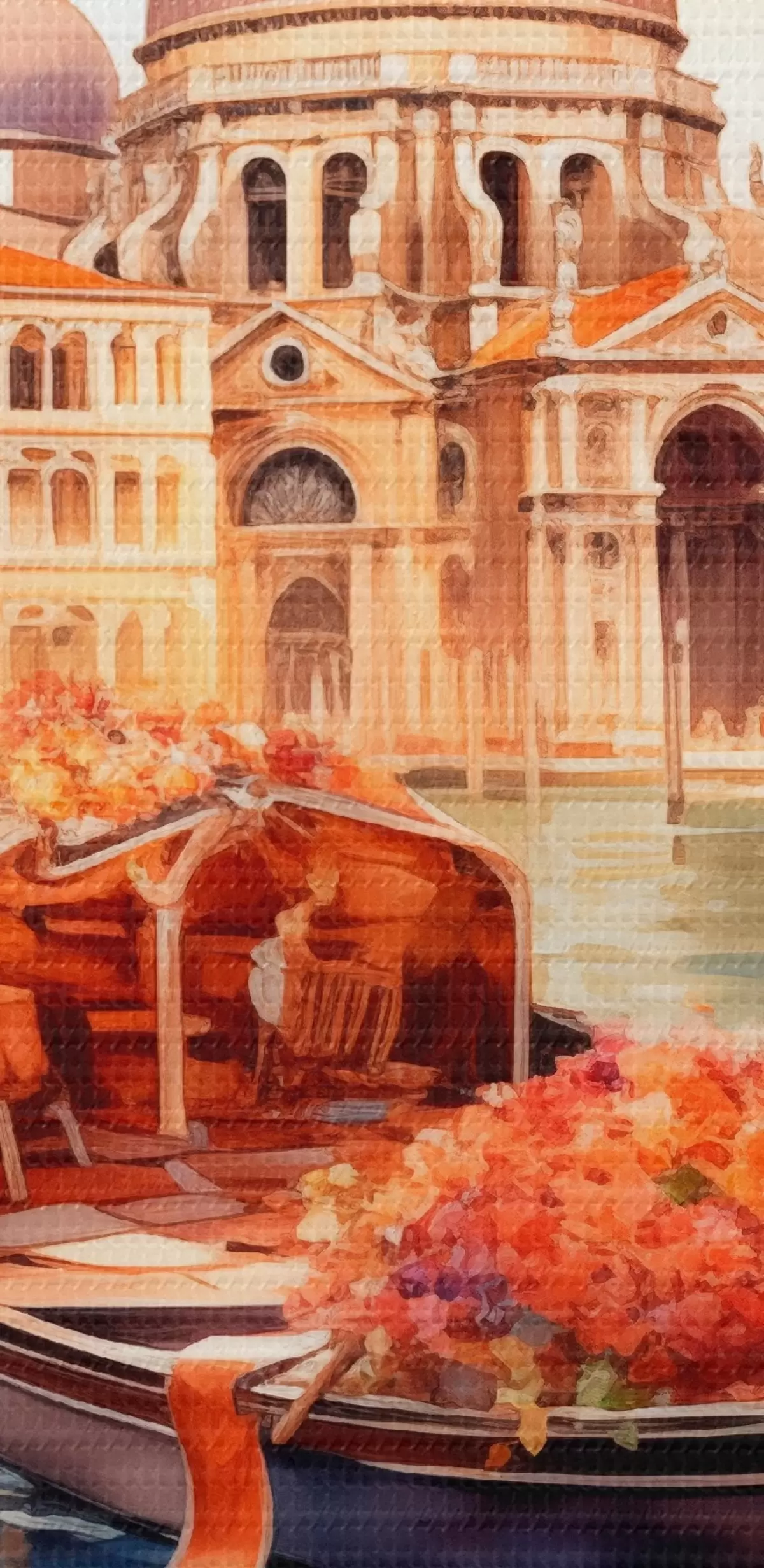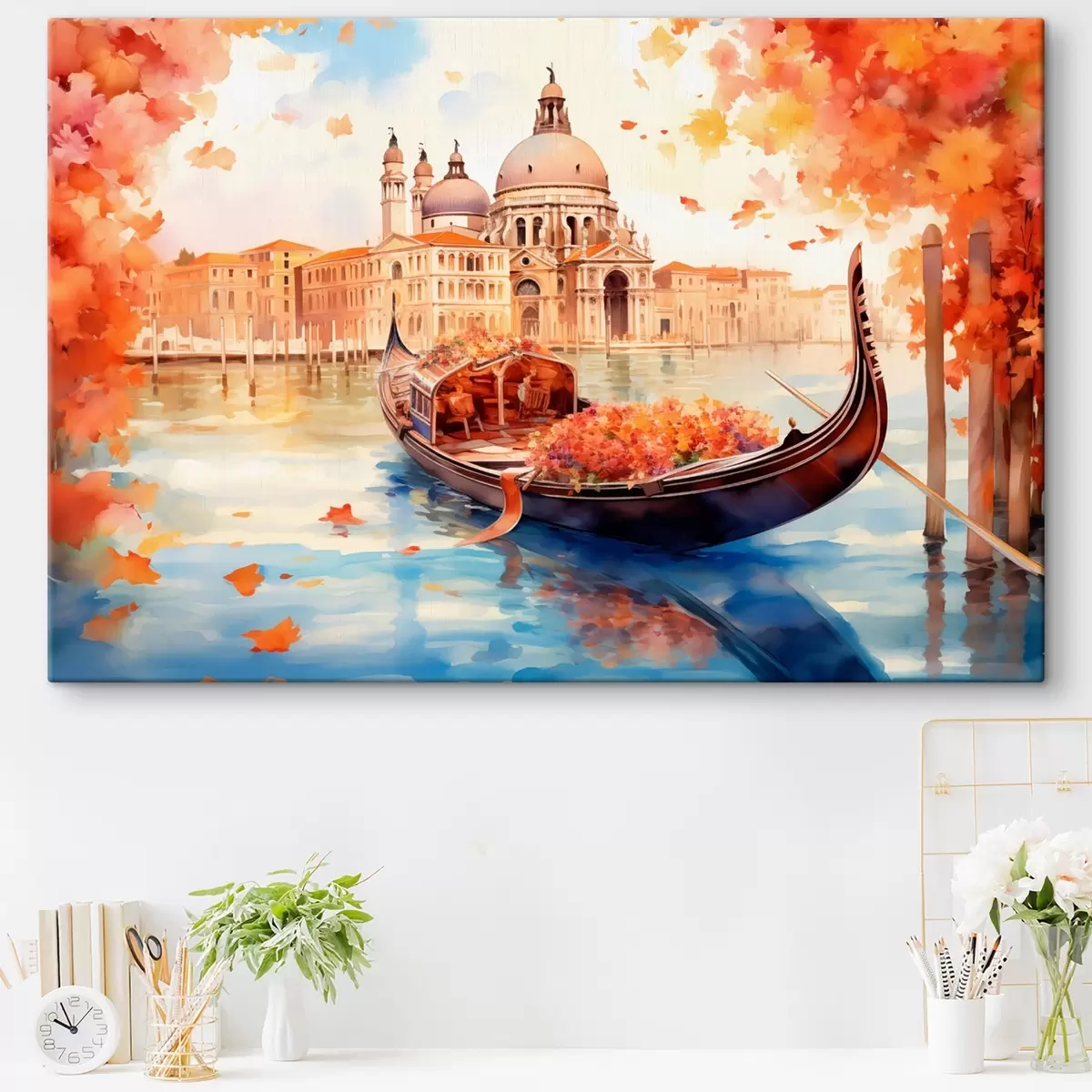 Картина Осінній вид Венеції з гондоли, оточеної яскравим помаранчевим і червоним листям, з відображеннями будівель у спокійній воді каналу. Арт. s42576