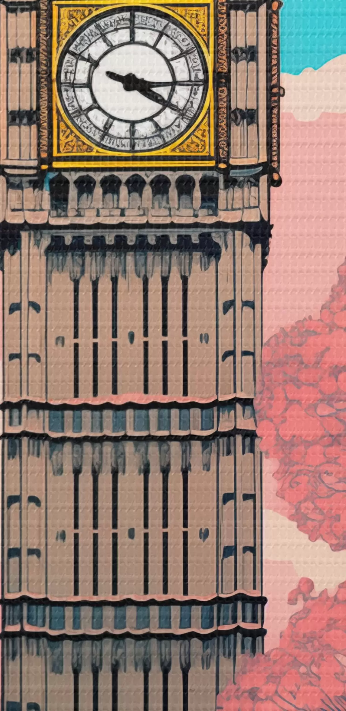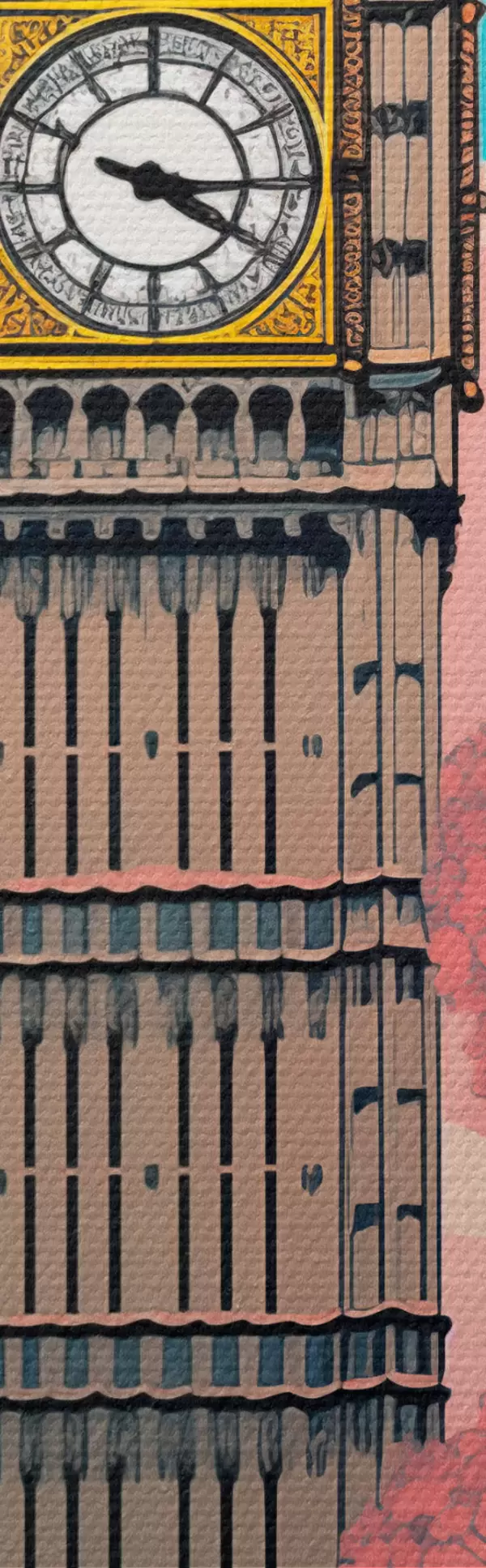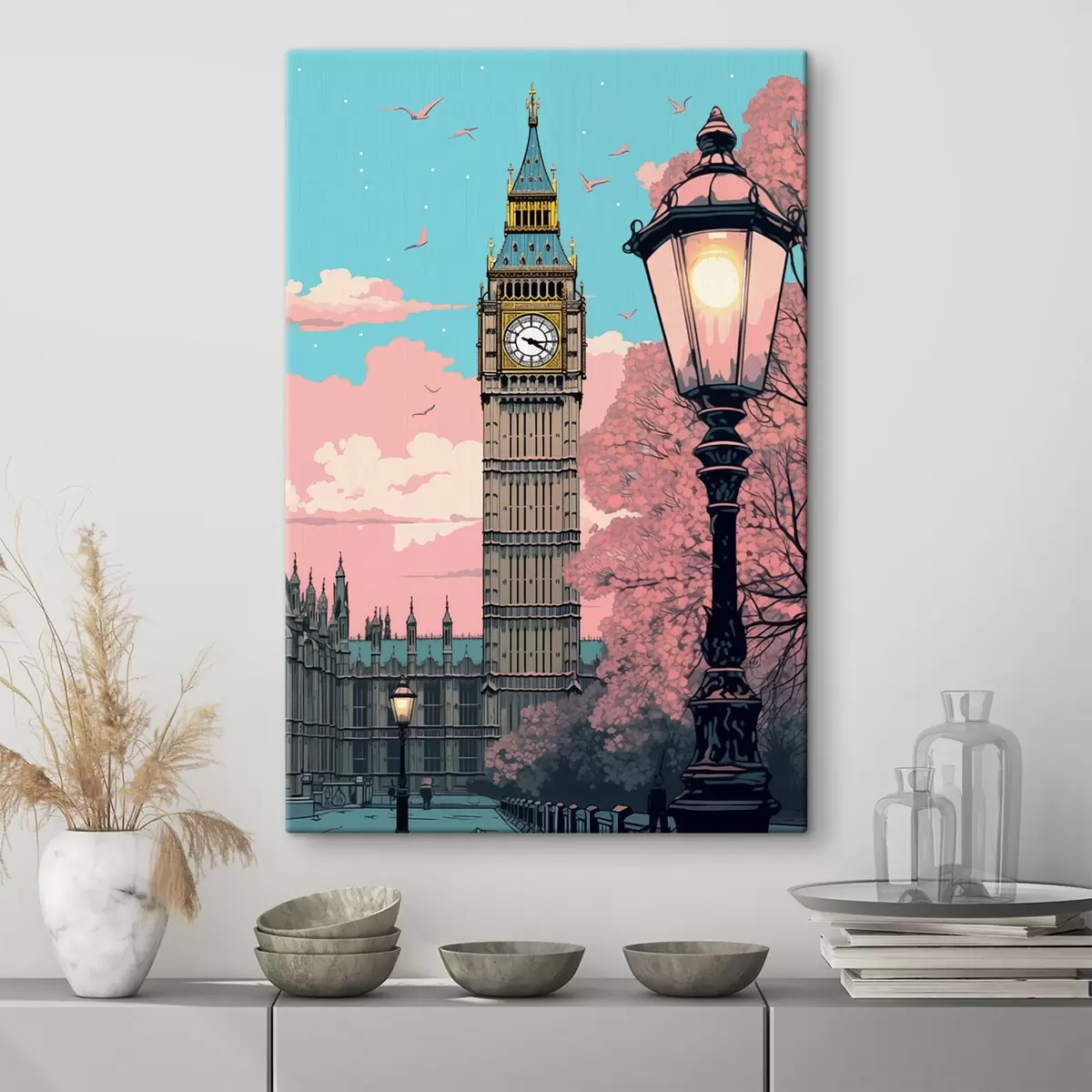 Картина Вид на Біг-Бен з весняними рожевими деревами, яскраво-блакитним небом і вінтажним ліхтарем на передньому плані. s42578