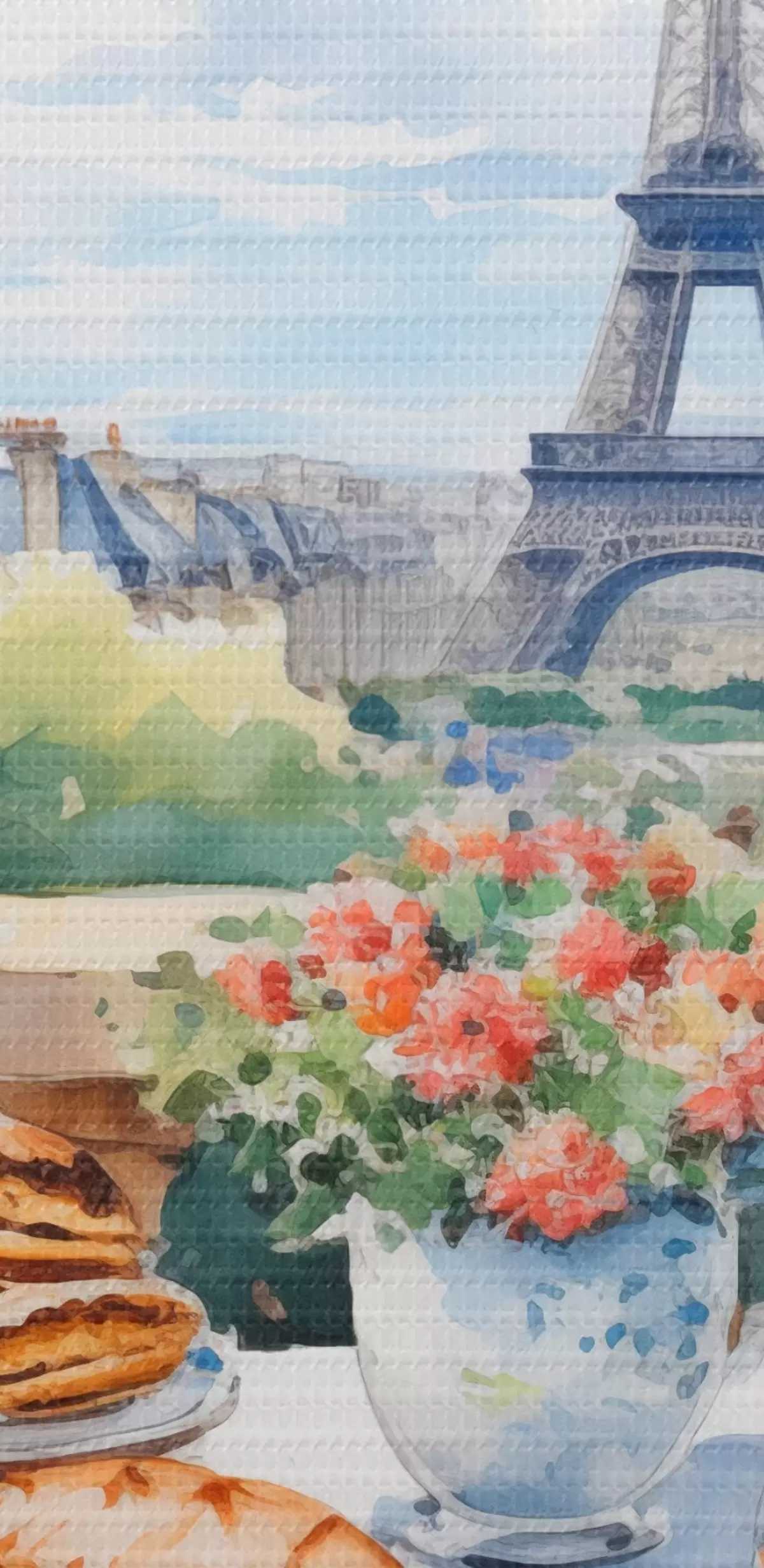 Картина Романтичний вид на Ейфелеву вежу з балкона зі столом, накритим десертами, чаєм і квітами в літній атмосфері. Арт. s42579