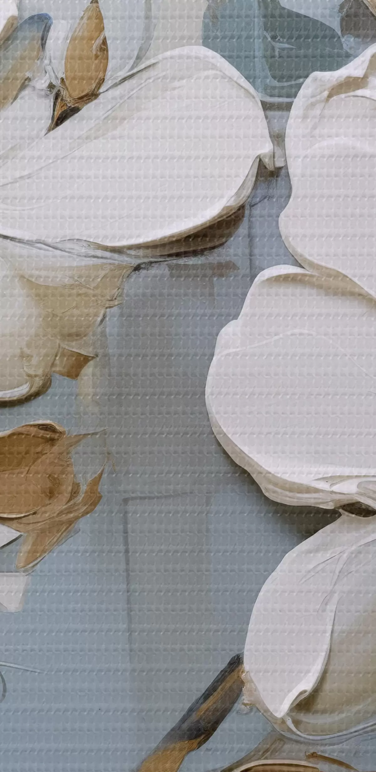 Картина Білі квіти магнолії з фактурними пелюстками та коричневим листям на ніжно-блакитному тлі з імітацією олійного живопису Арт. s42711