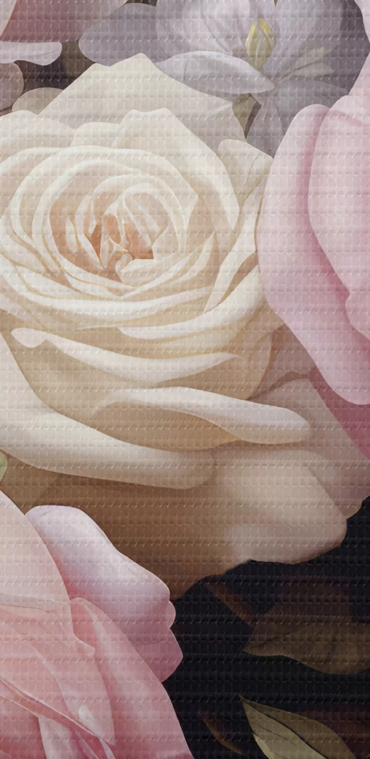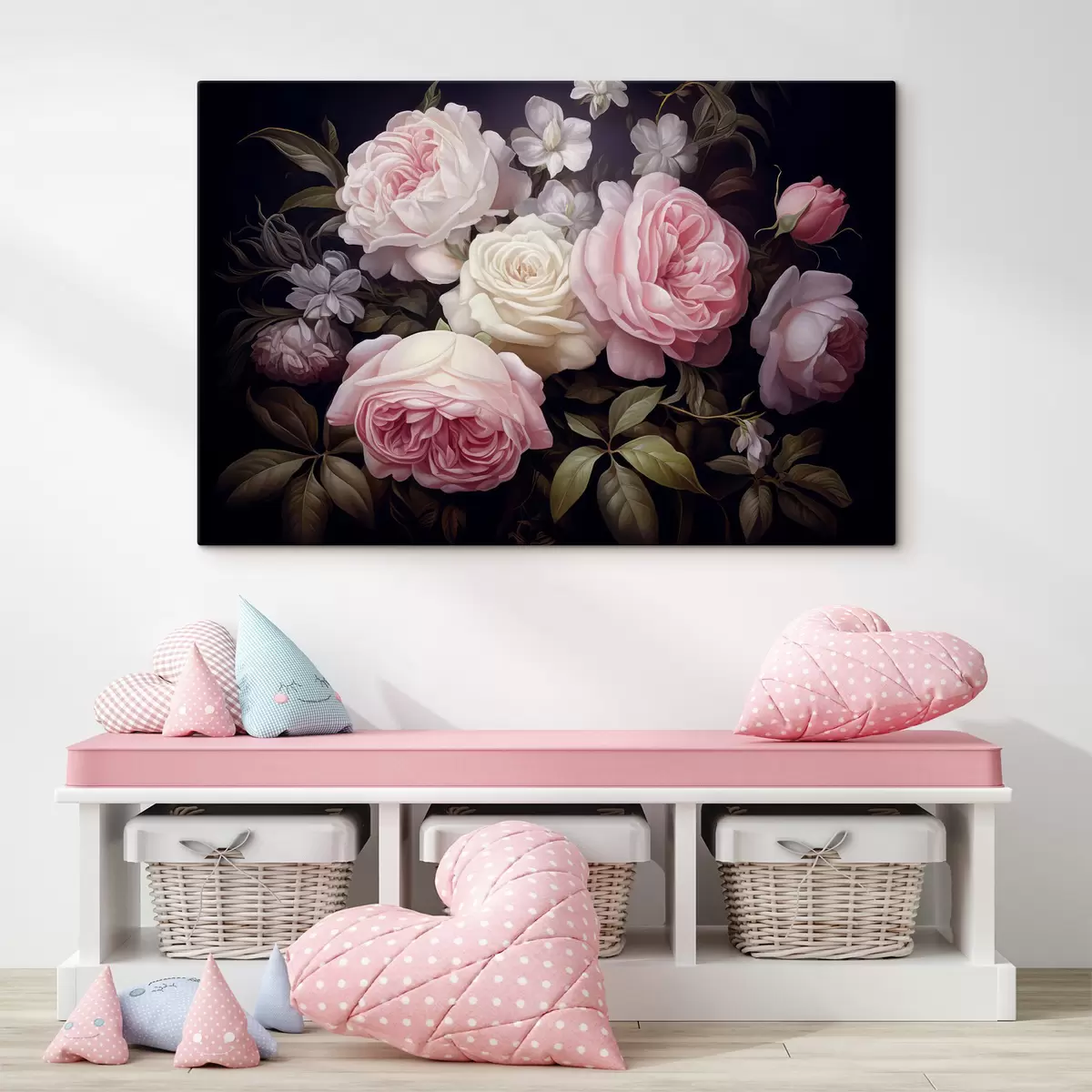 Картина Рожеві та білі троянди з ніжними білими квітами та зеленим листям на темному тлі Арт. s42721