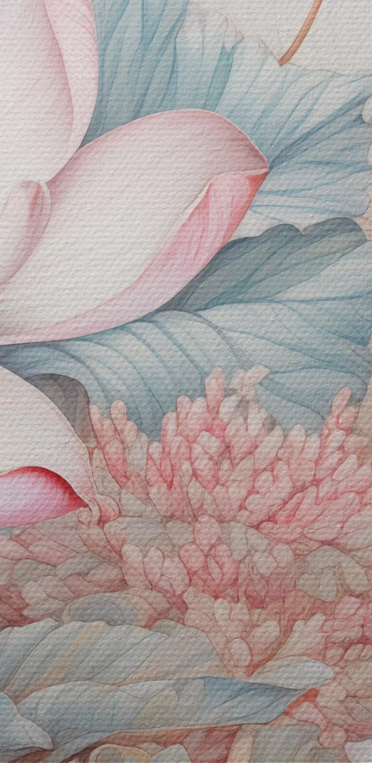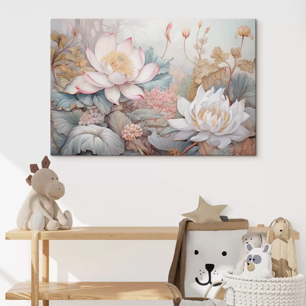 Картина Великі, квітучі квіти лотоса в ніжно-рожевих і білих відтінках, оточені зеленим листям і ніжним рожевим листям s42729