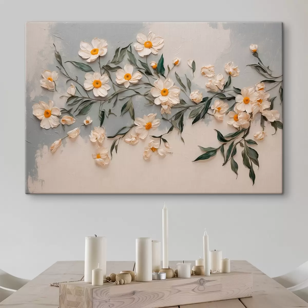 Картина Білі квіти та листя на біло-сірому тлі Арт. s42764