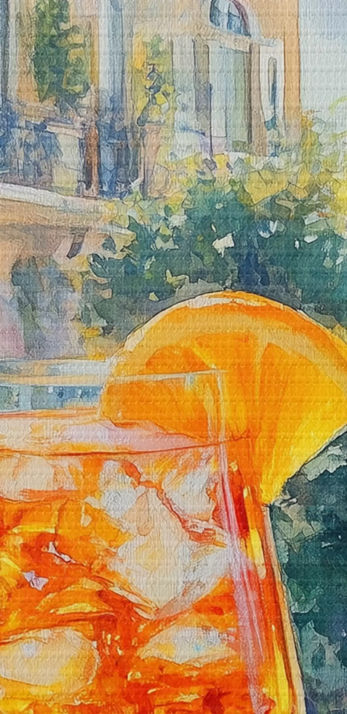 Картина Коктейль з апельсинами, акварельний стиль, Італія, Aperol Spritz, архітектура, літній сад  s43061