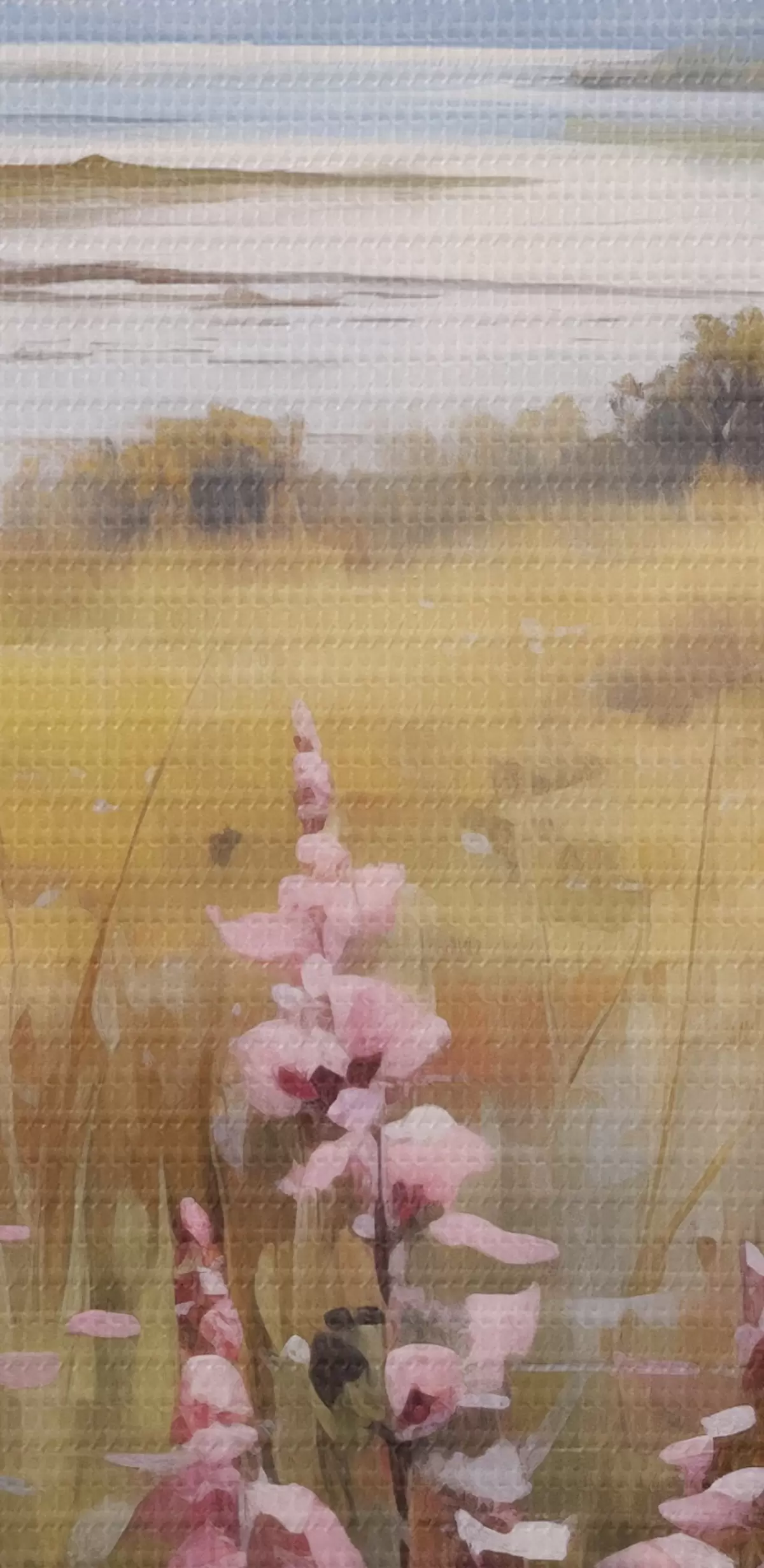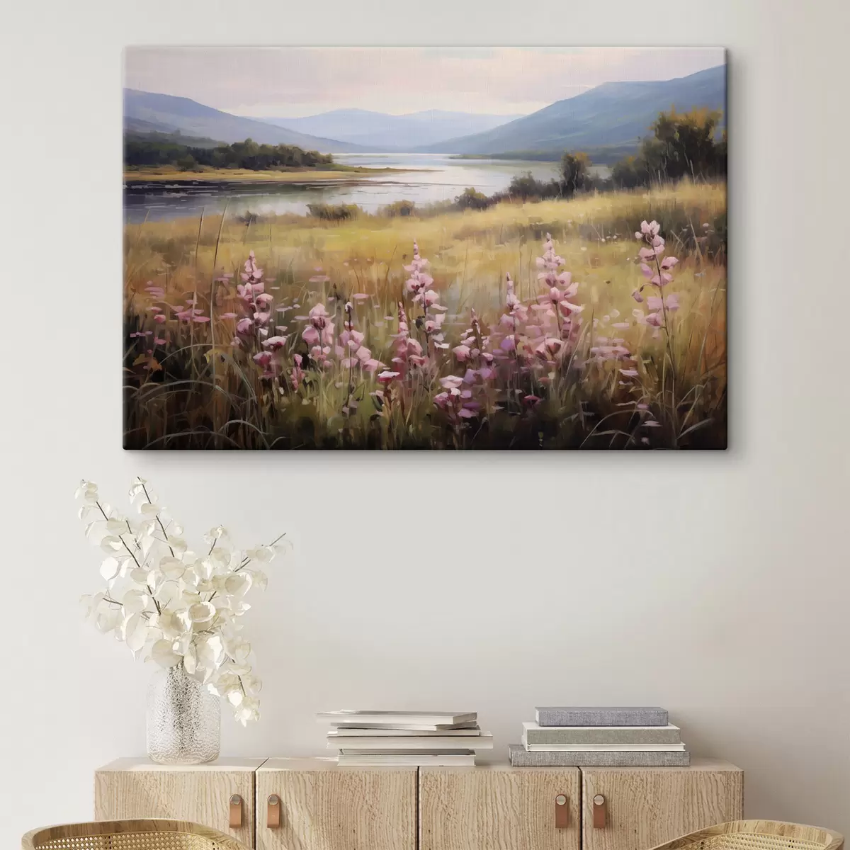 Картина Пейзаж з полем рожевих квітів, озером і горами на задньому плані, під хмарним небом Арт. s43165