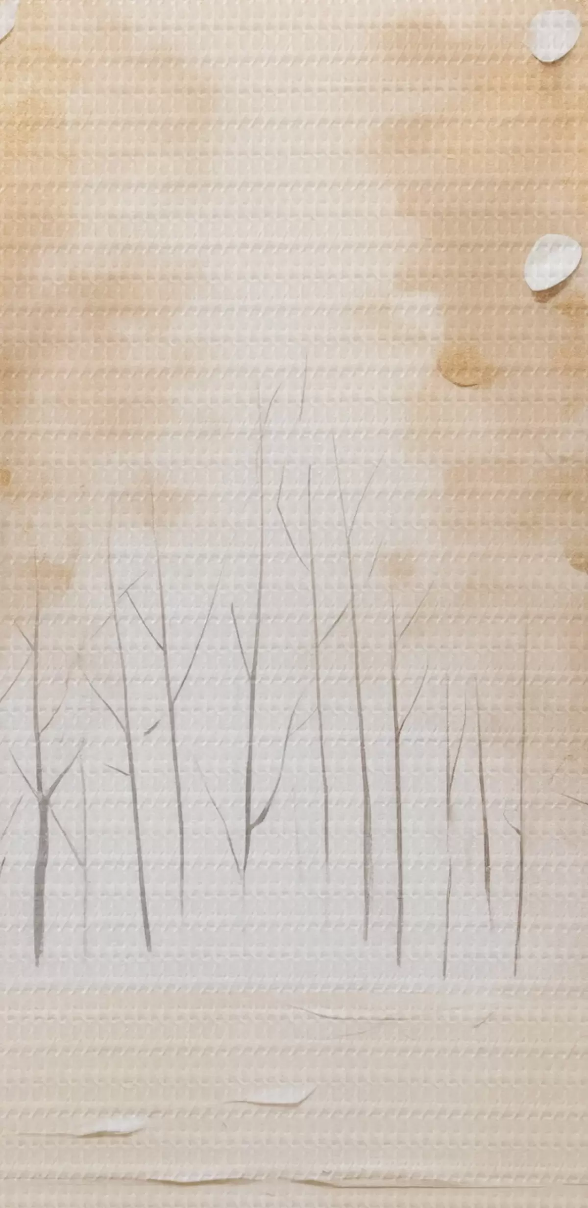 Картина Олійний живопис, що імітує коричневі дерева з білим листям у лісі з річкою посередині, біле тло s43172