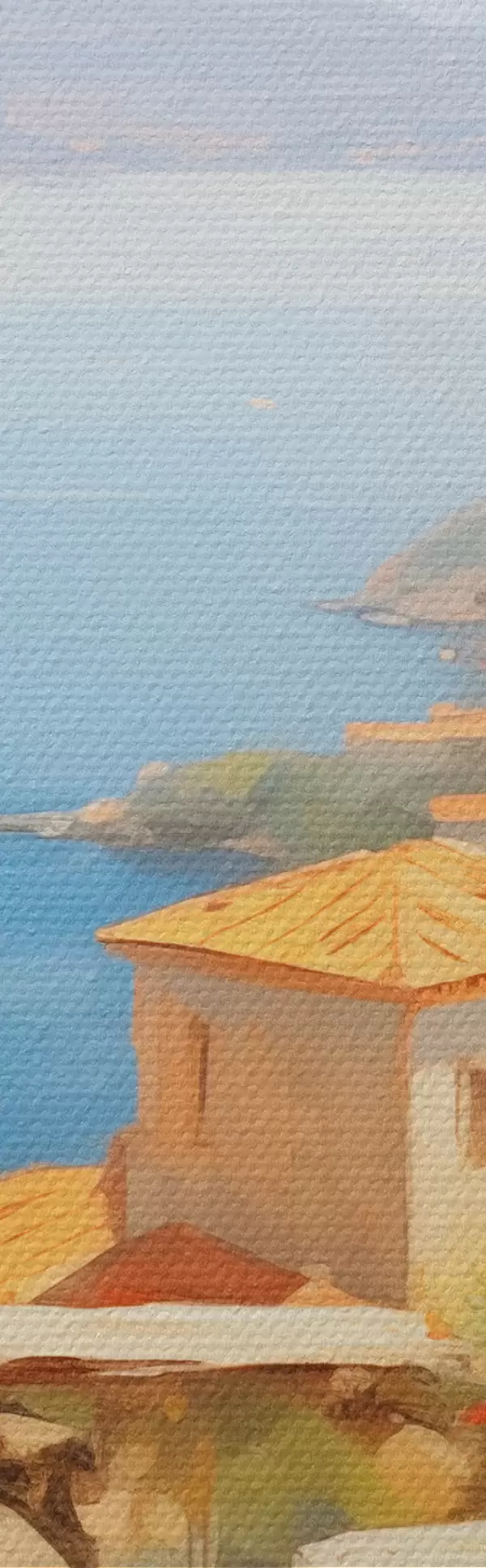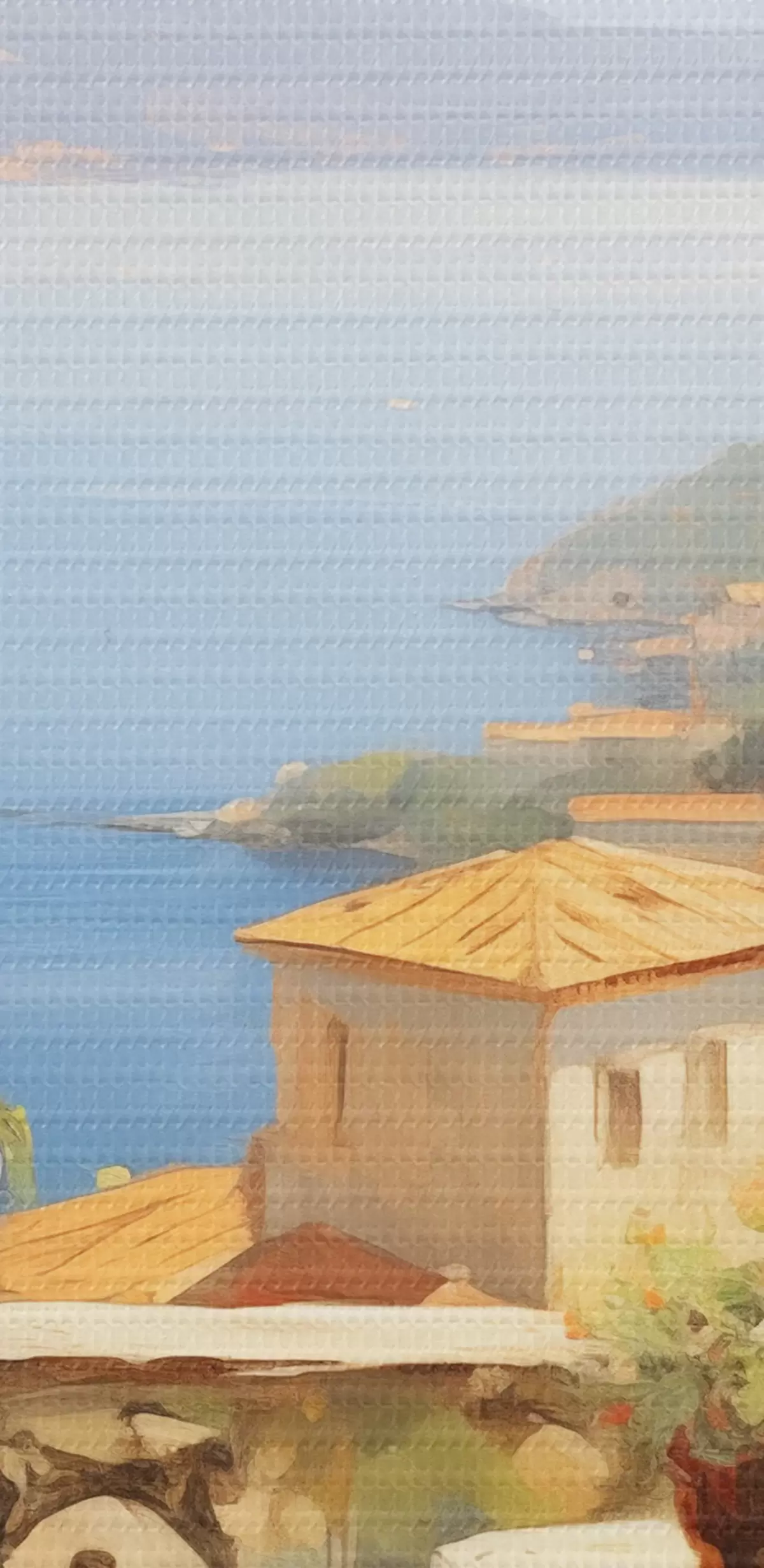 Картина Картина олійними фарбами з імітацією балкона з квітами, з видом на море, будинки на узбережжі, сонячний день, блакитне небо s43173
