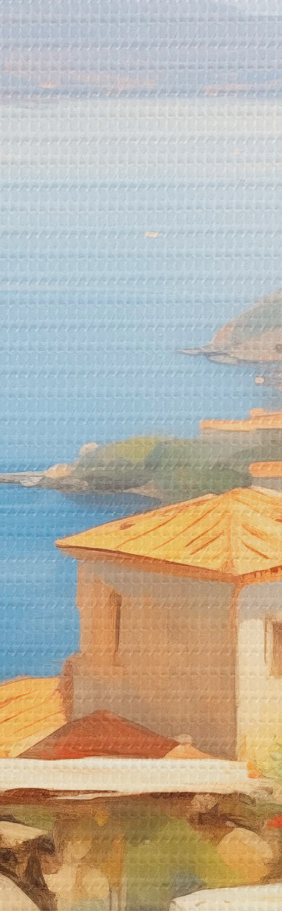 Картина Картина олійними фарбами з імітацією балкона з квітами, з видом на море, будинки на узбережжі, сонячний день, блакитне небо Арт. s43173