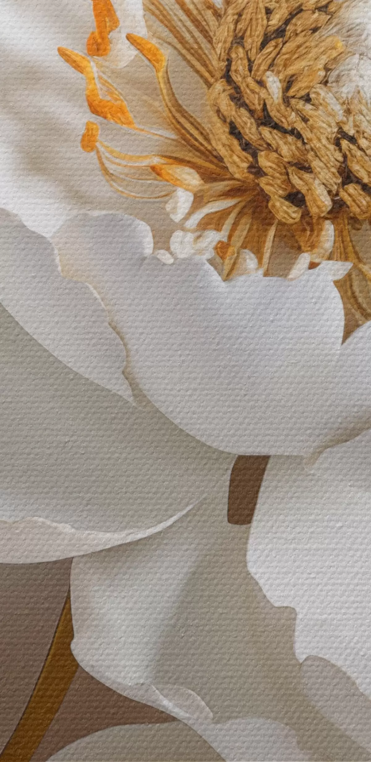 Картина Білі ніжні деталізовані декоративні квіти півонії з жовтим листям, фон світло-сірого кольору Арт. s43176