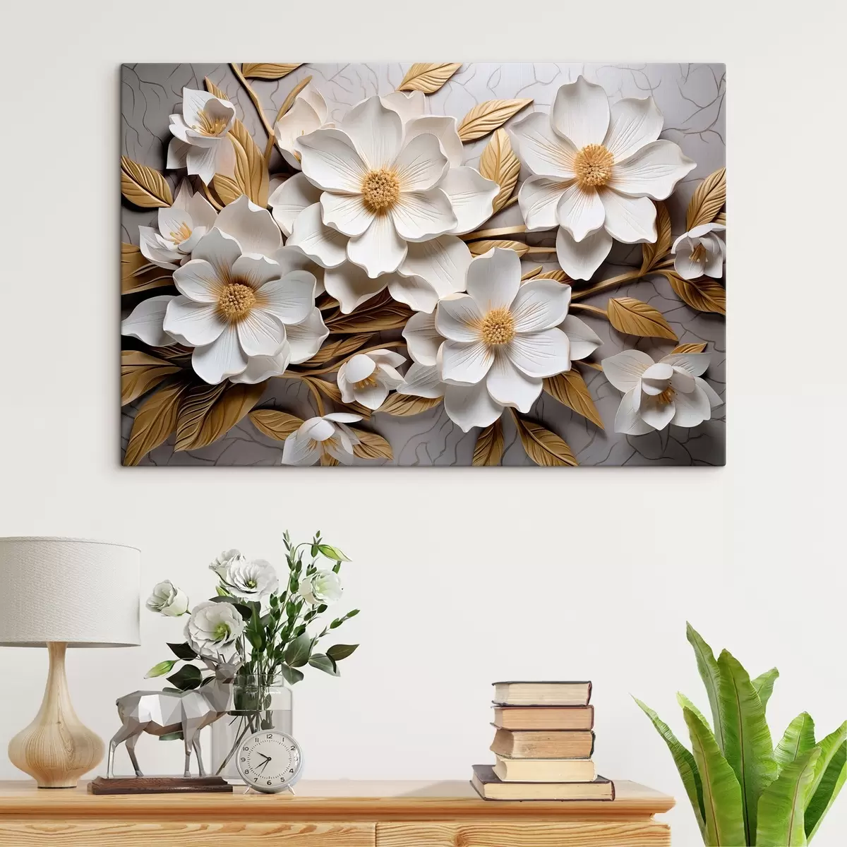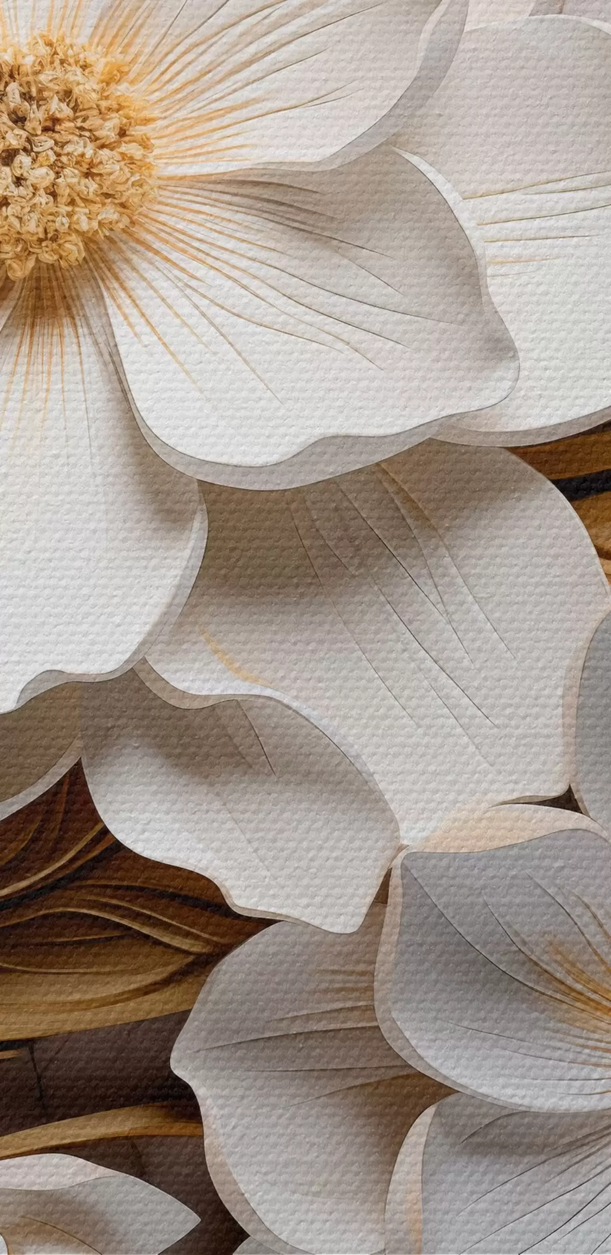 Картина Білі квіти в стилі рельєфної фрески з жовтим листям і тичинками s43330