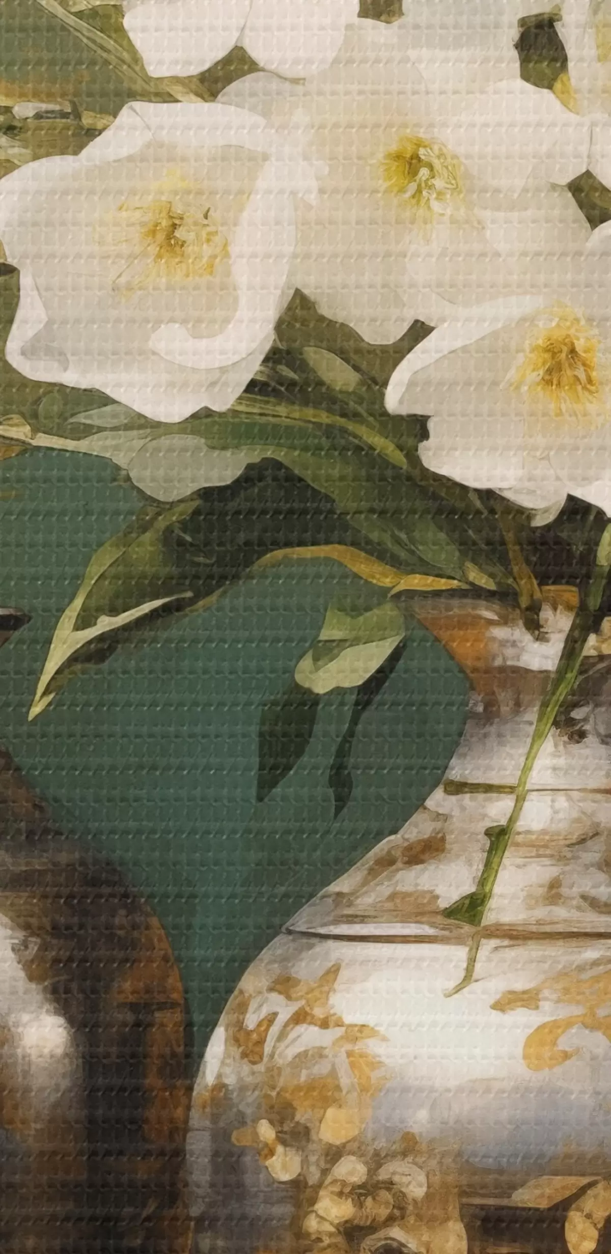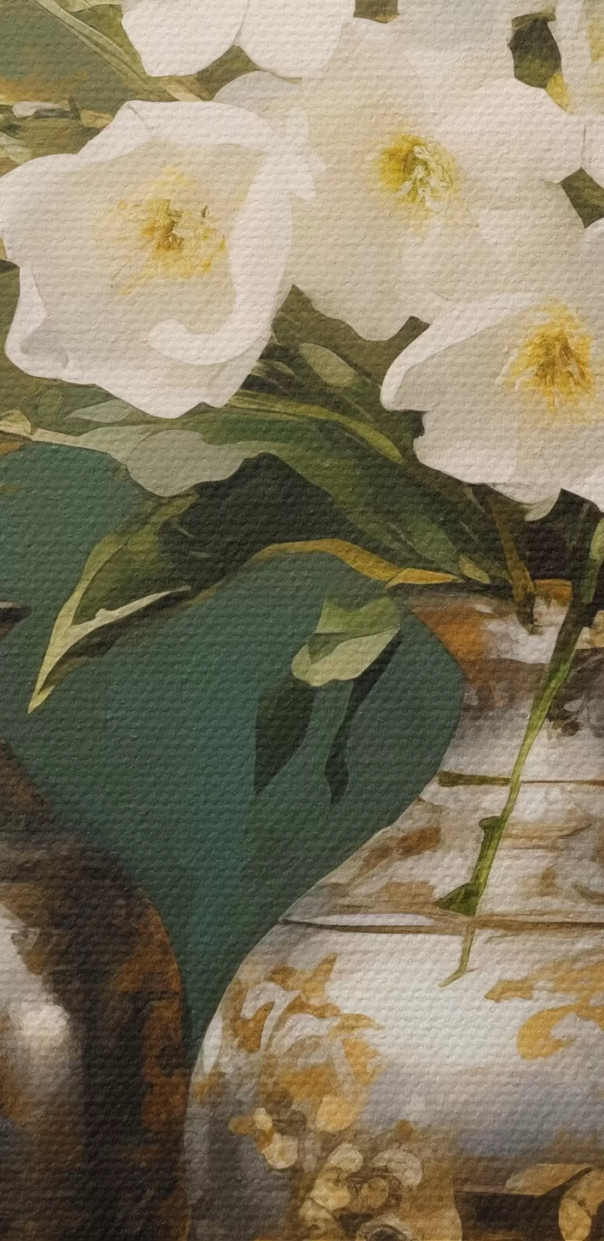 Картина Натюрморт з білими квітами у вазі, з декоративними вазами і мискою на зеленому столі, на темно-зеленому тлі s43408