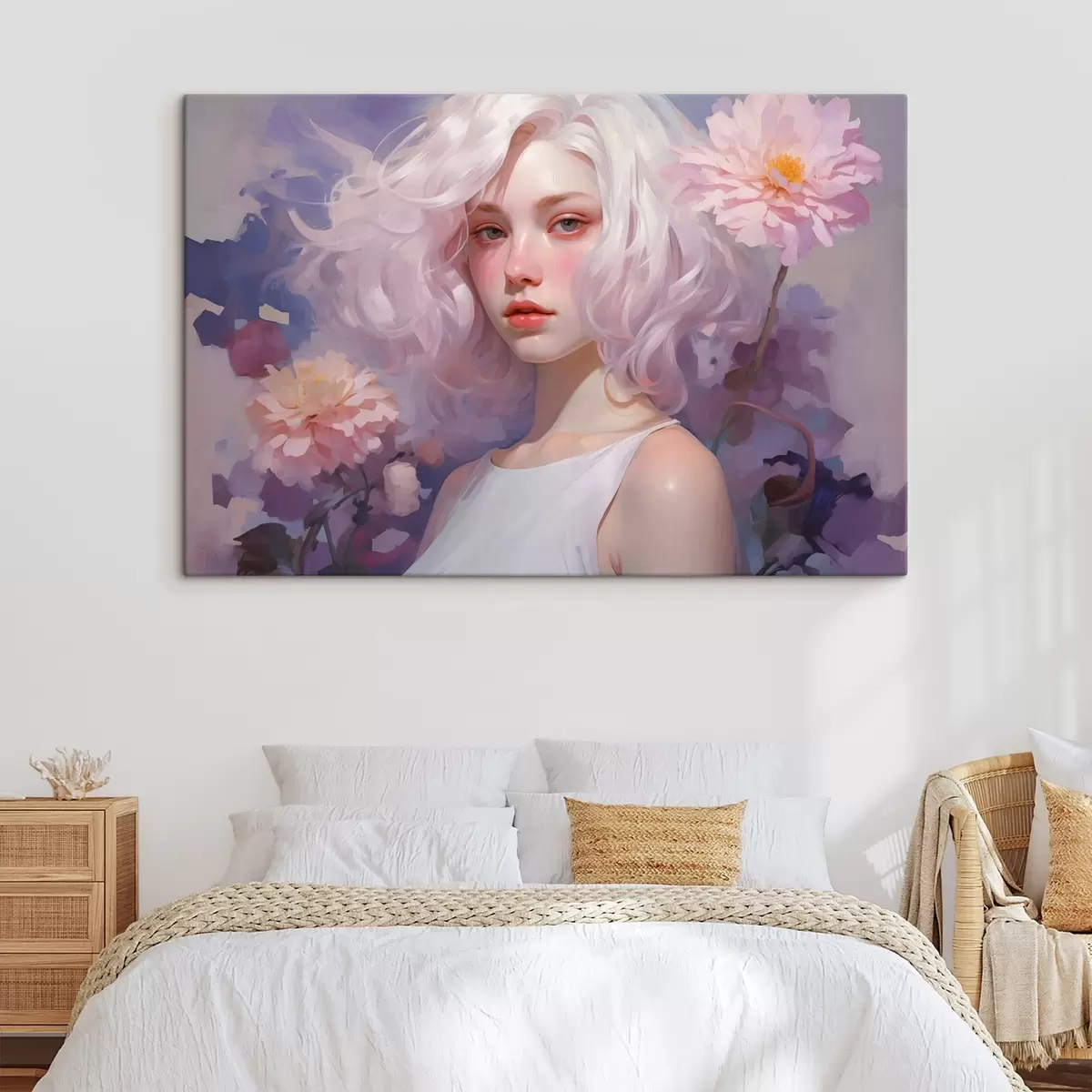 Картина Красива дівчина в квітах, малюнок акрилом, Японія, фіолетові кольори s43495