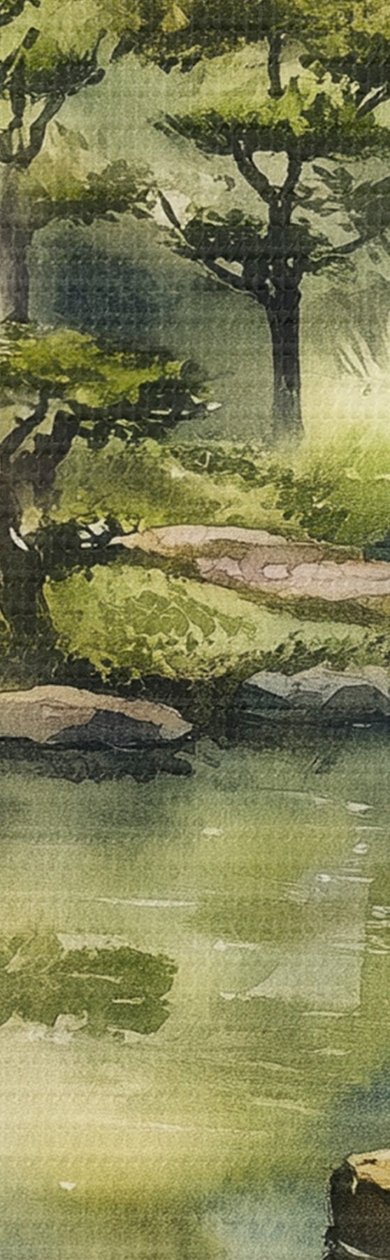 Картина Східний ліс зі скелями, ставком і соснами, зелень, акварельний стиль Арт. s44311