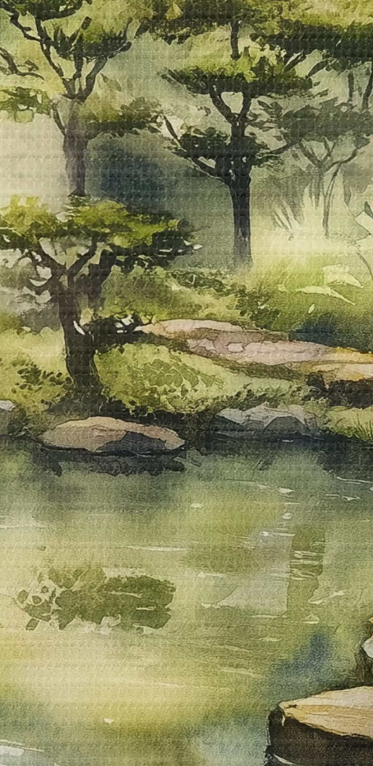 Картина Східний ліс зі скелями, ставком і соснами, зелень, акварельний стиль Арт. s44311