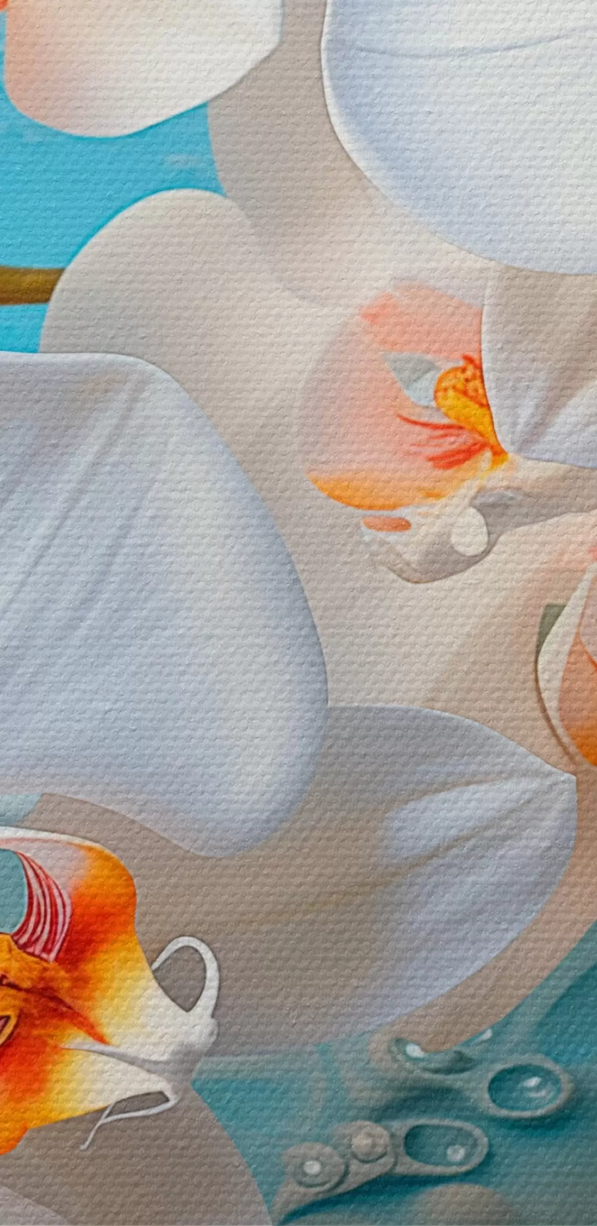 Картина Білі орхідеї, розташовані на світло-блакитній поверхні з крапельками води, м'яке освітлення Арт. s44401