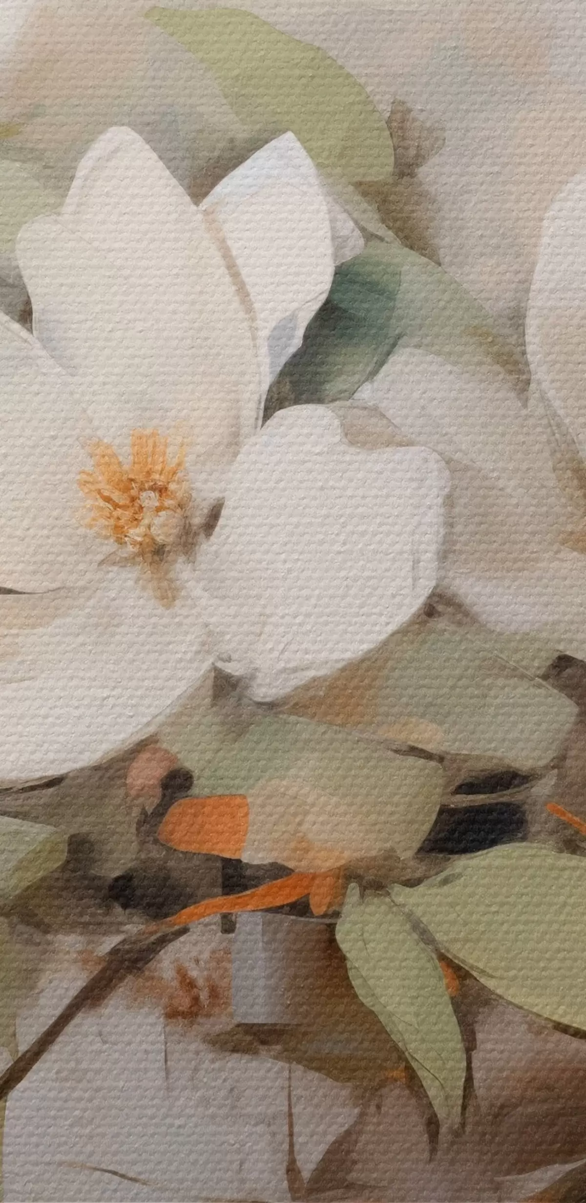 Картина Білі квіти магнолії з зеленим листям на гілці, м'які мазки, приглушені кольори s44404