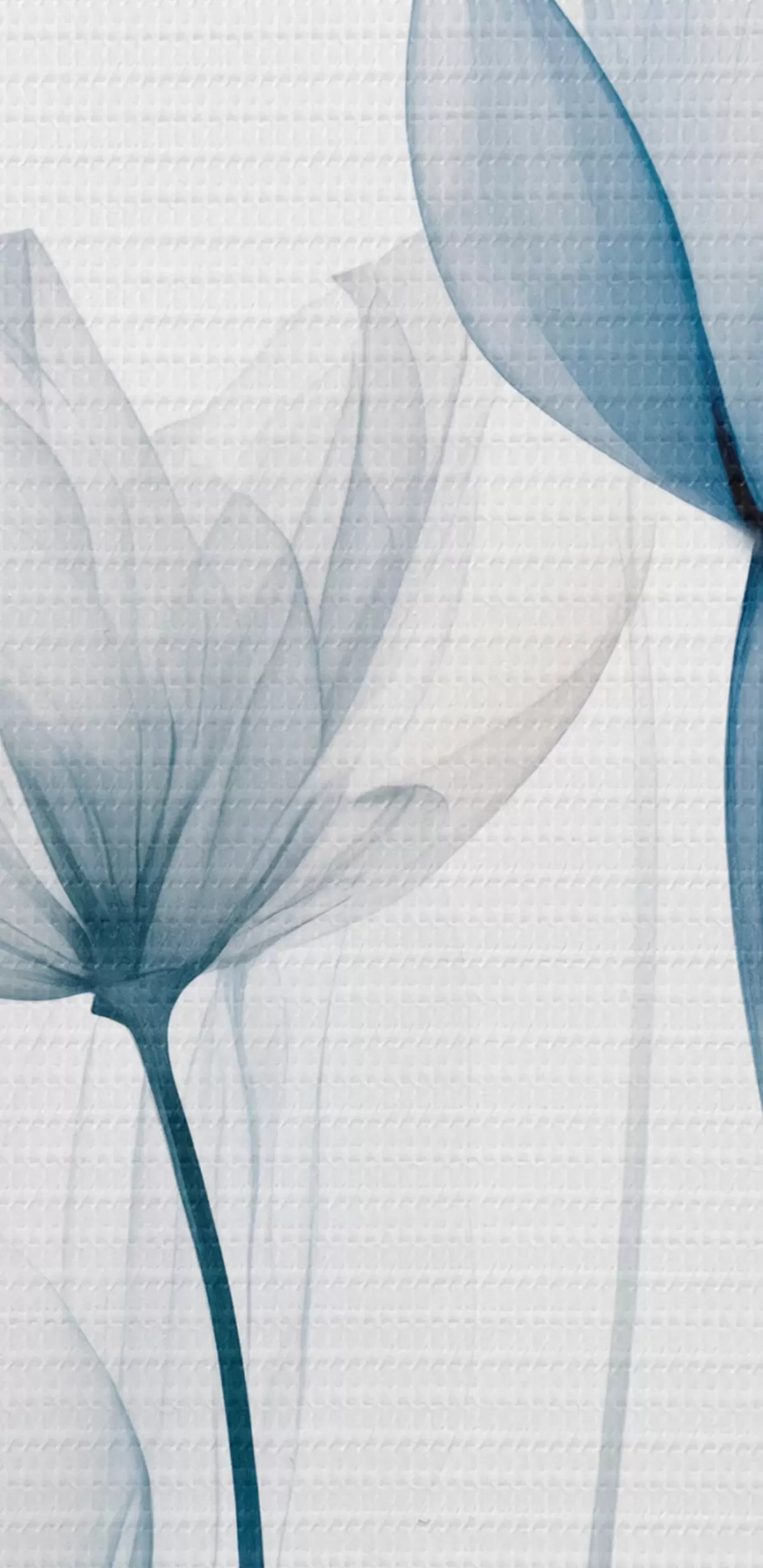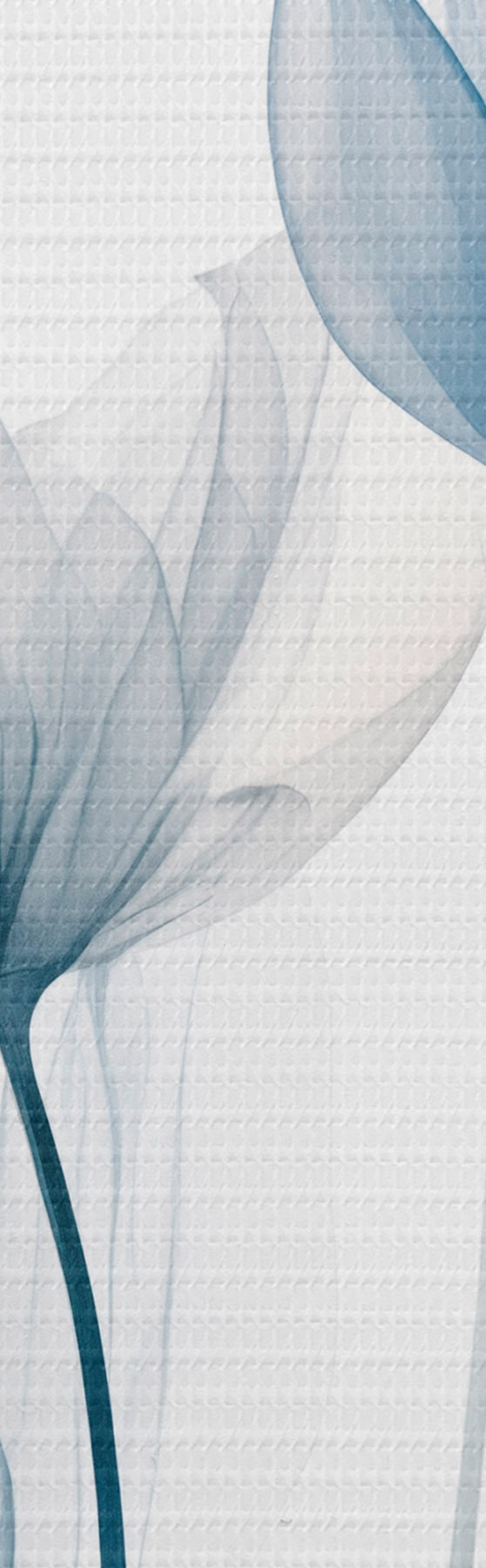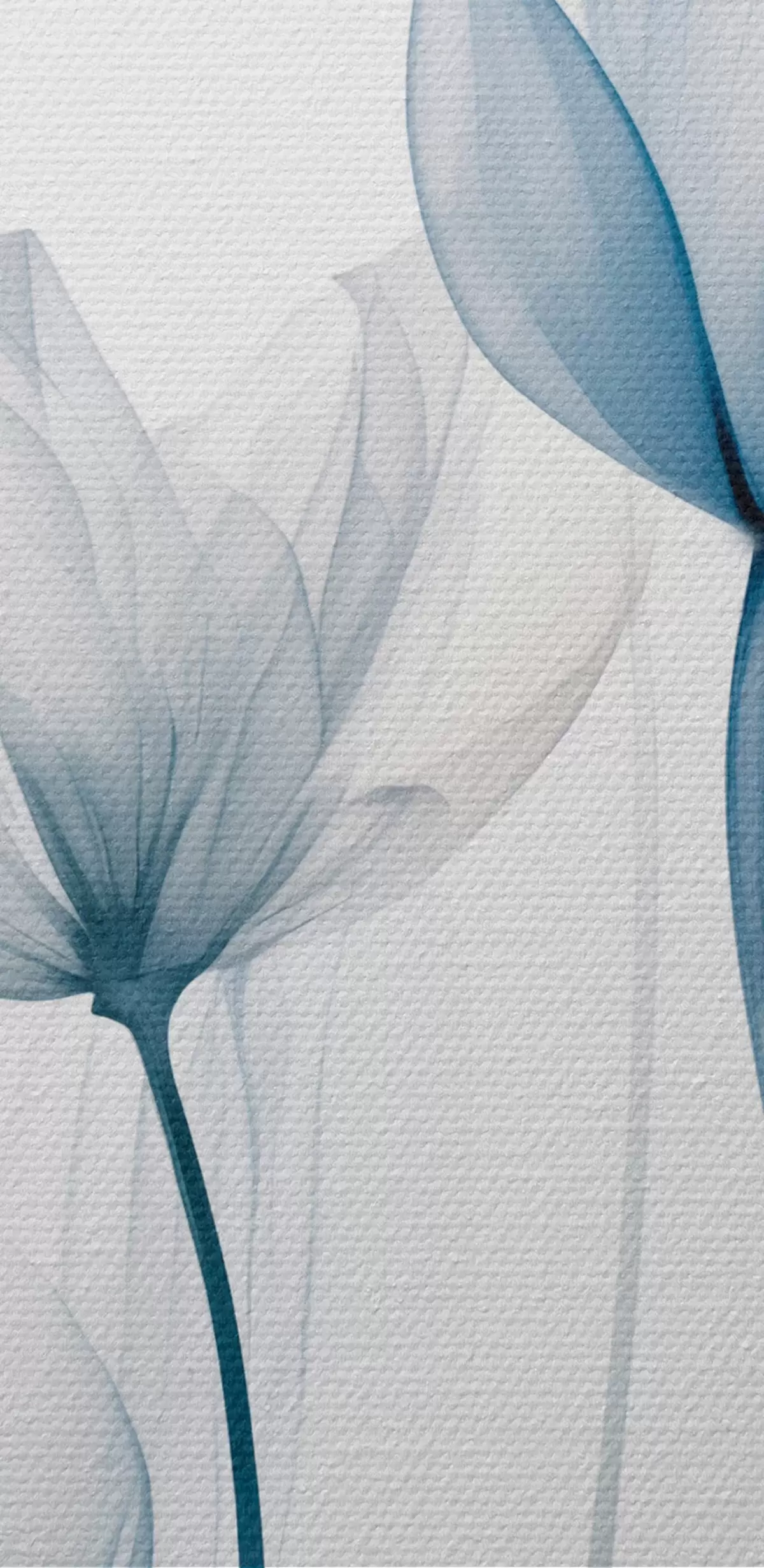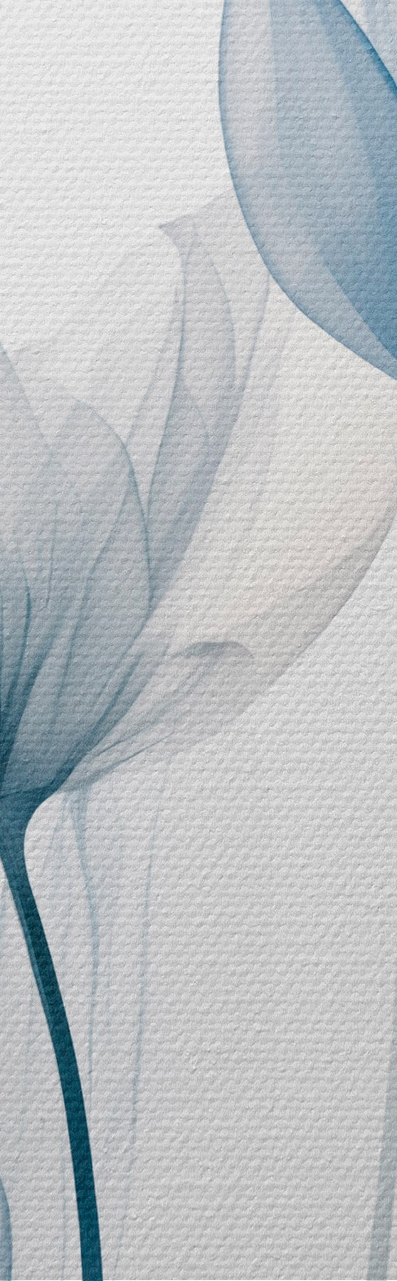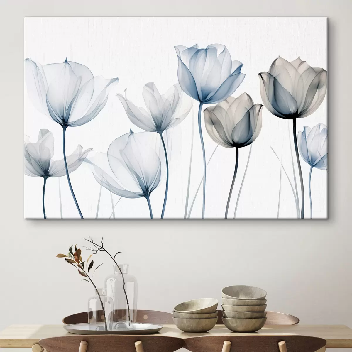 Картина Напівпрозорі сині та білі тюльпани з довгими стеблами на однотонному білому тлі Арт. s44409