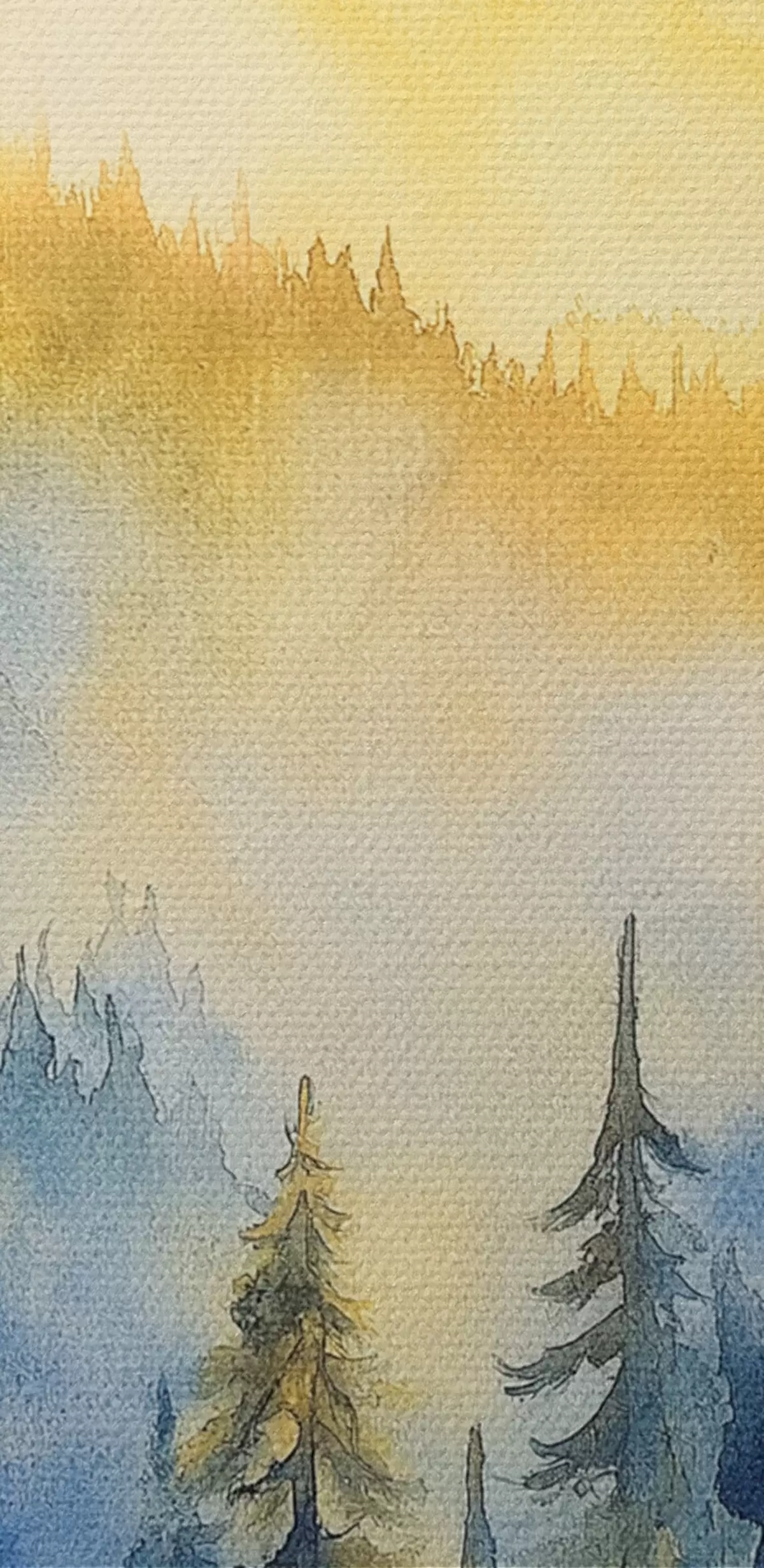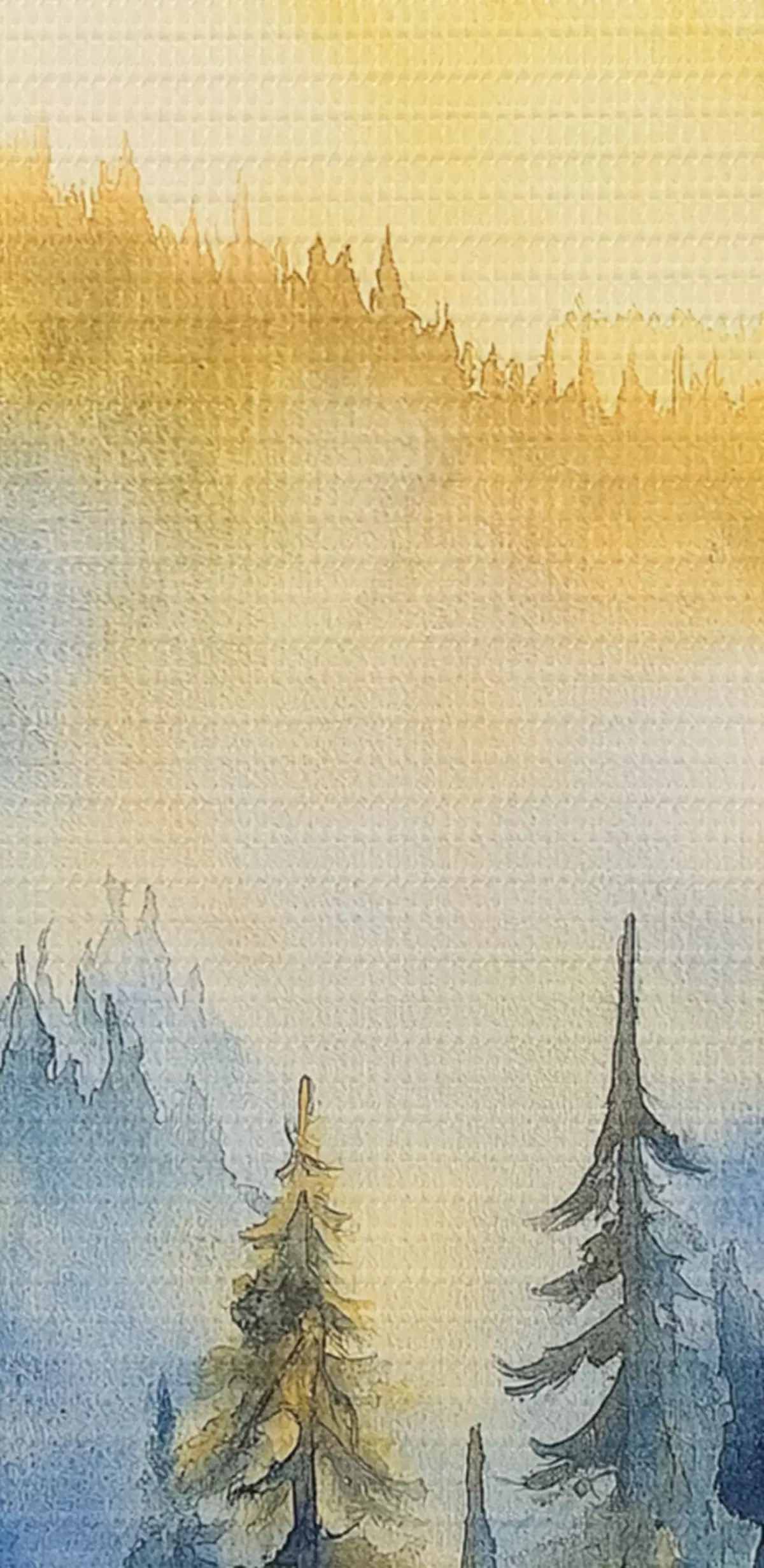 Картина Туманні гори на сході сонця, соснові ліси, синьо-жовті кольори Арт. s44602