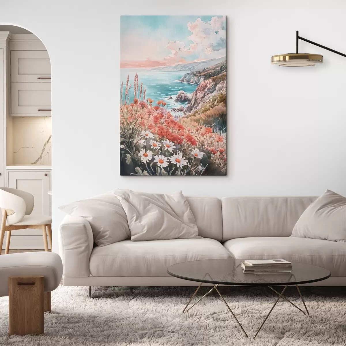 Картина Португальське узбережжя океану на заході сонця, лугові квіти s44612