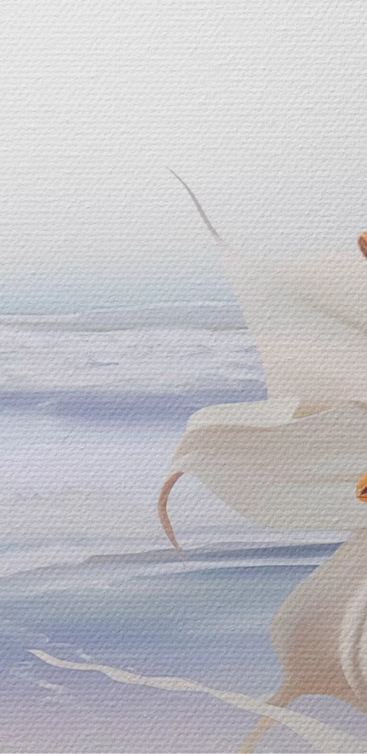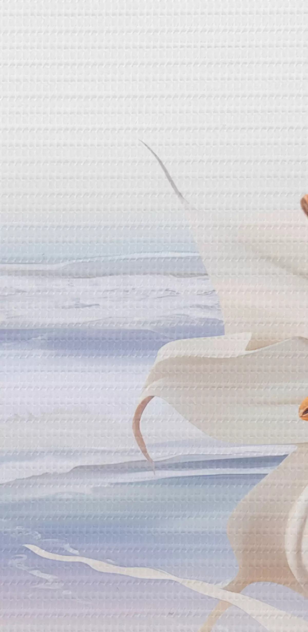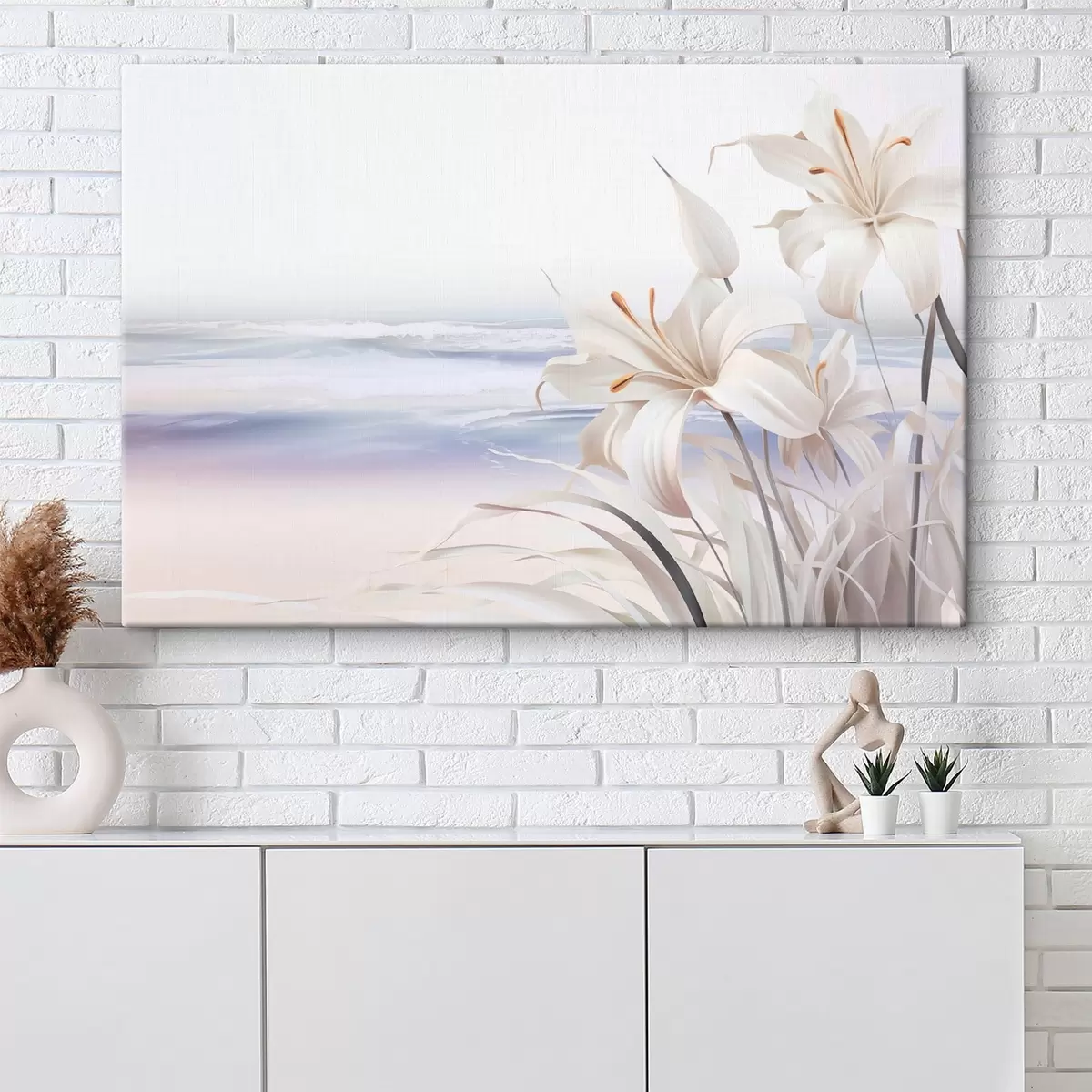 Картина Білі лілії з помаранчевими маточками і довгим листям на пляжі з м'якими хвилями на задньому плані, пастельні кольори s44850