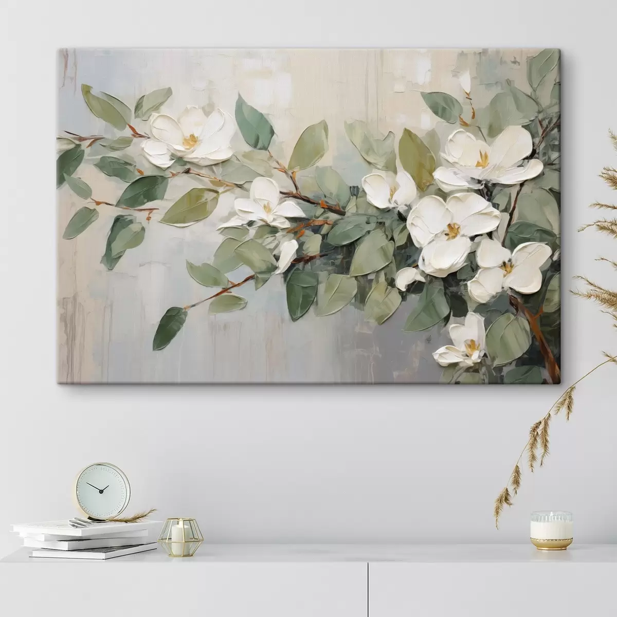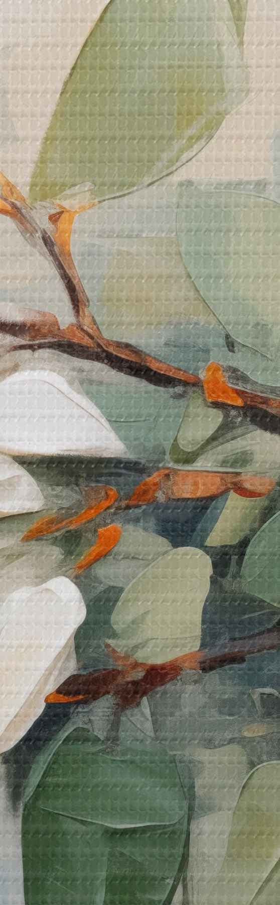 Картина Квіти магнолії з зеленим листям на гілці, фактурний стиль імпасто, м'яка кольорова палітра Арт. s44853