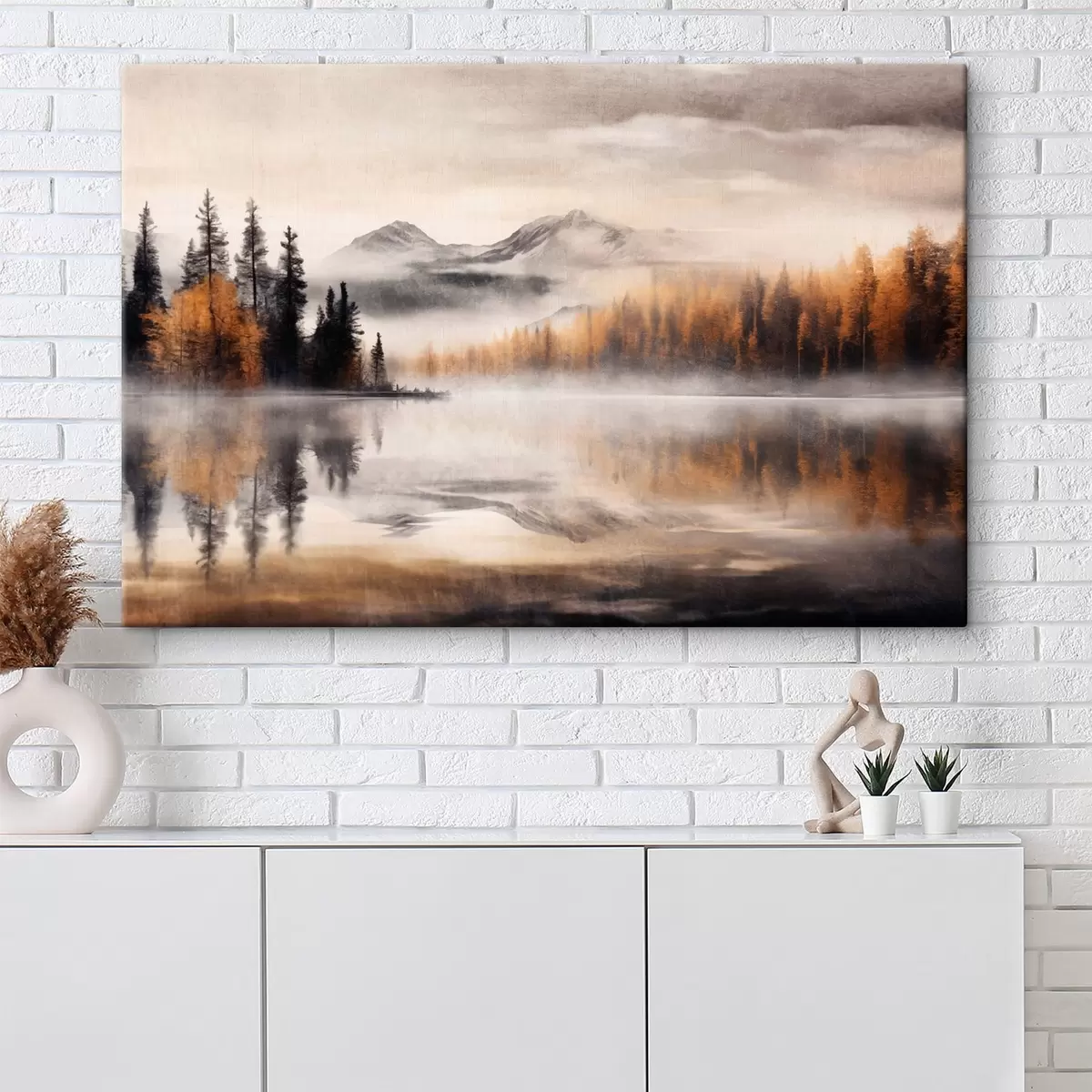 Картина Туманний фактурний озерний пейзаж з соснами та горами, хмарне сіре небо Арт. s44856