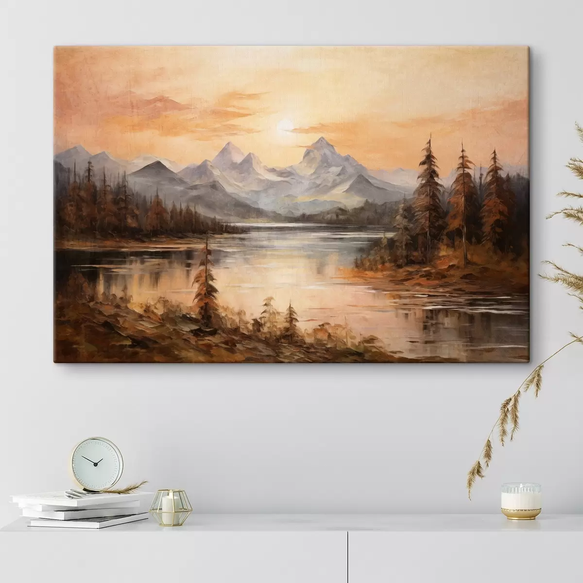 Картина Пейзаж з озером, оточеним деревами і горами на задньому плані, помаранчеве небо з сонцем Арт. s44857