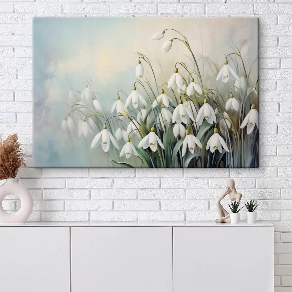 Картина Білі квіти підсніжника з синьо-зеленими стеблами та листям, м'які мазки, розмите тло Арт. s44864