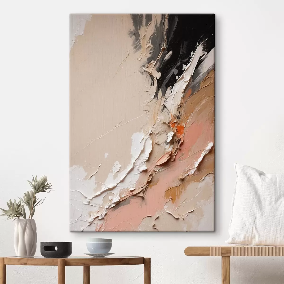 Картина Бежево-чорна абстракція з акцентами рожевого та білого s44875