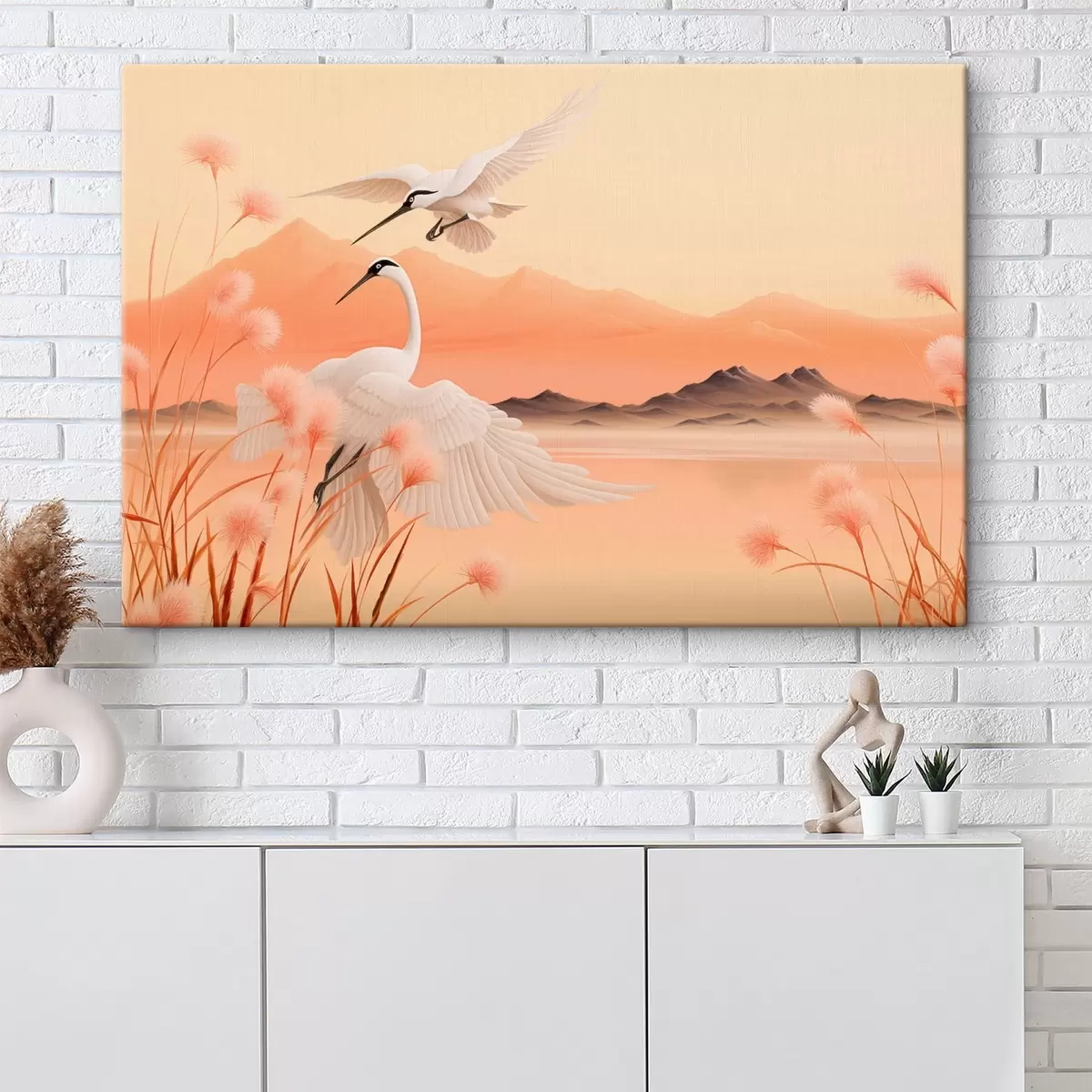 Картина Білі журавлі з рожевим очеретом на передньому плані, гори та озеро на задньому плані, м'яке помаранчеве світло Арт. s44925