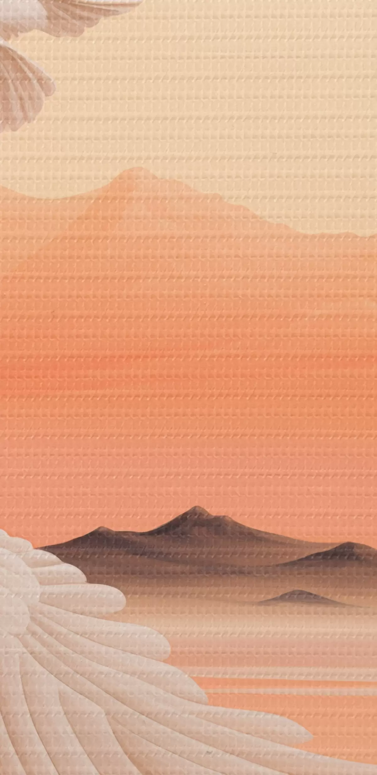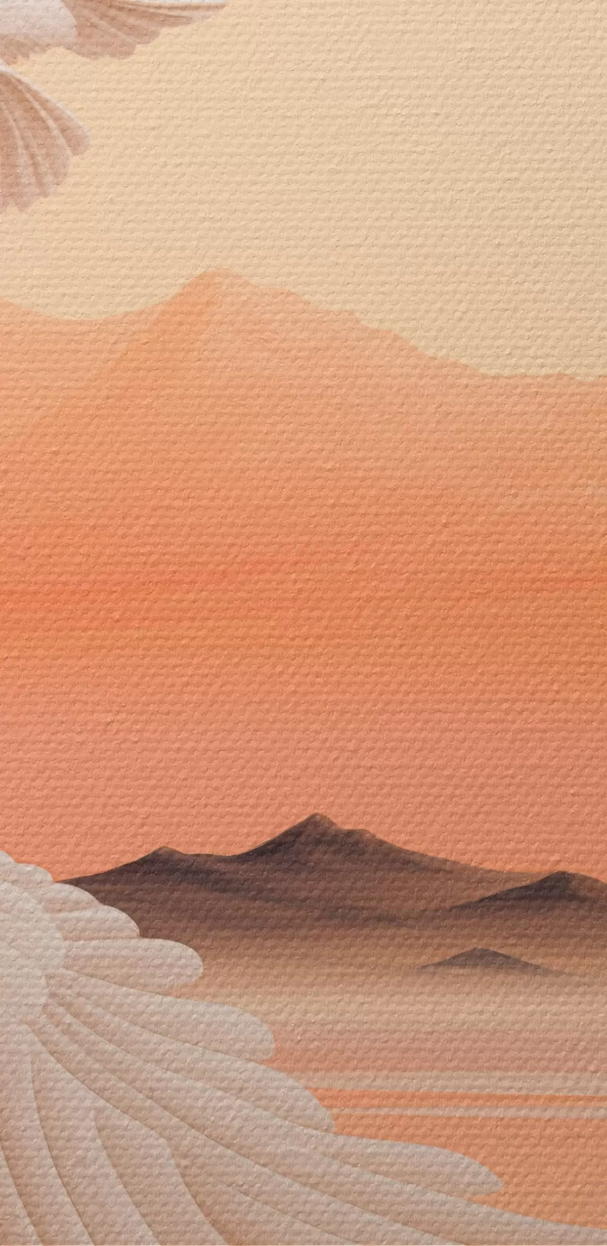 Картина Білі журавлі з рожевим очеретом на передньому плані, гори та озеро на задньому плані, м'яке помаранчеве світло s44925