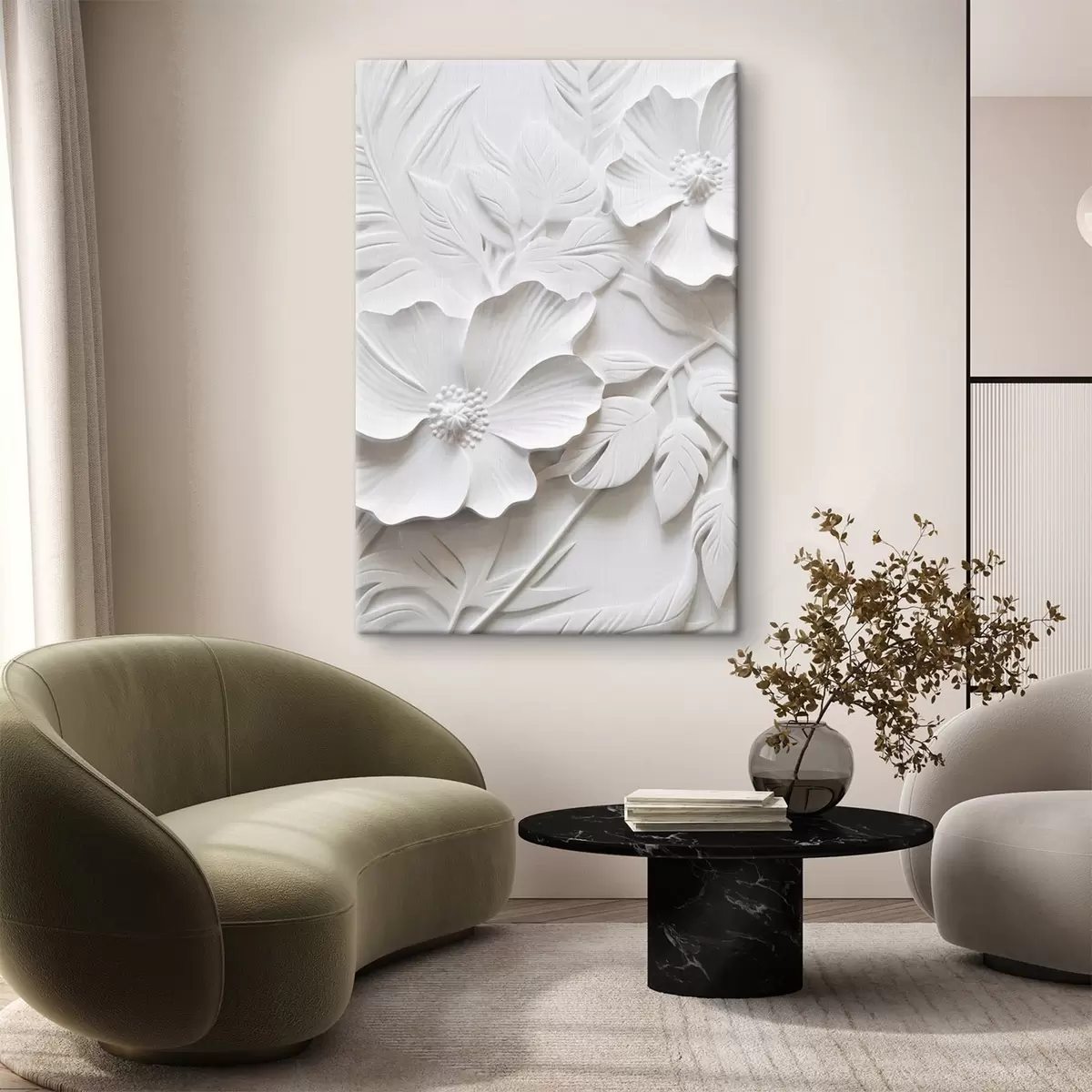 Картина Декоративні мінімалістичні білі квіти з листям, імітація рельєфу, білий фон Арт. s45180