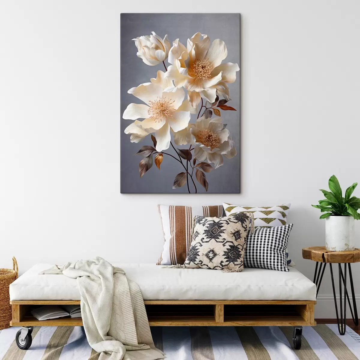 Картина Текстуровані квіти з помаранчевими маточками та помаранчевим листям на сірому тлі, м'яке світло, елегантні, деталізовані, реалістичні s45181