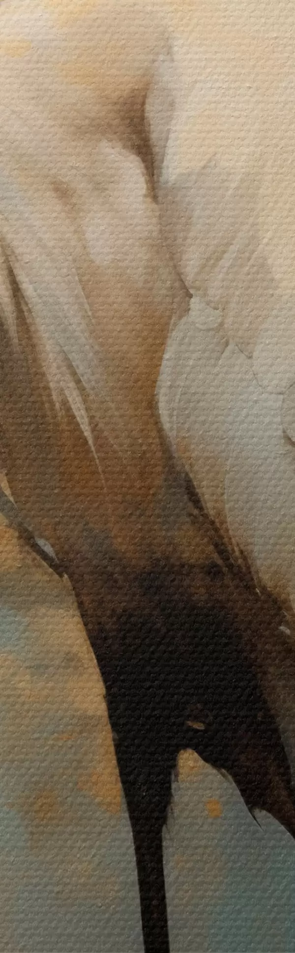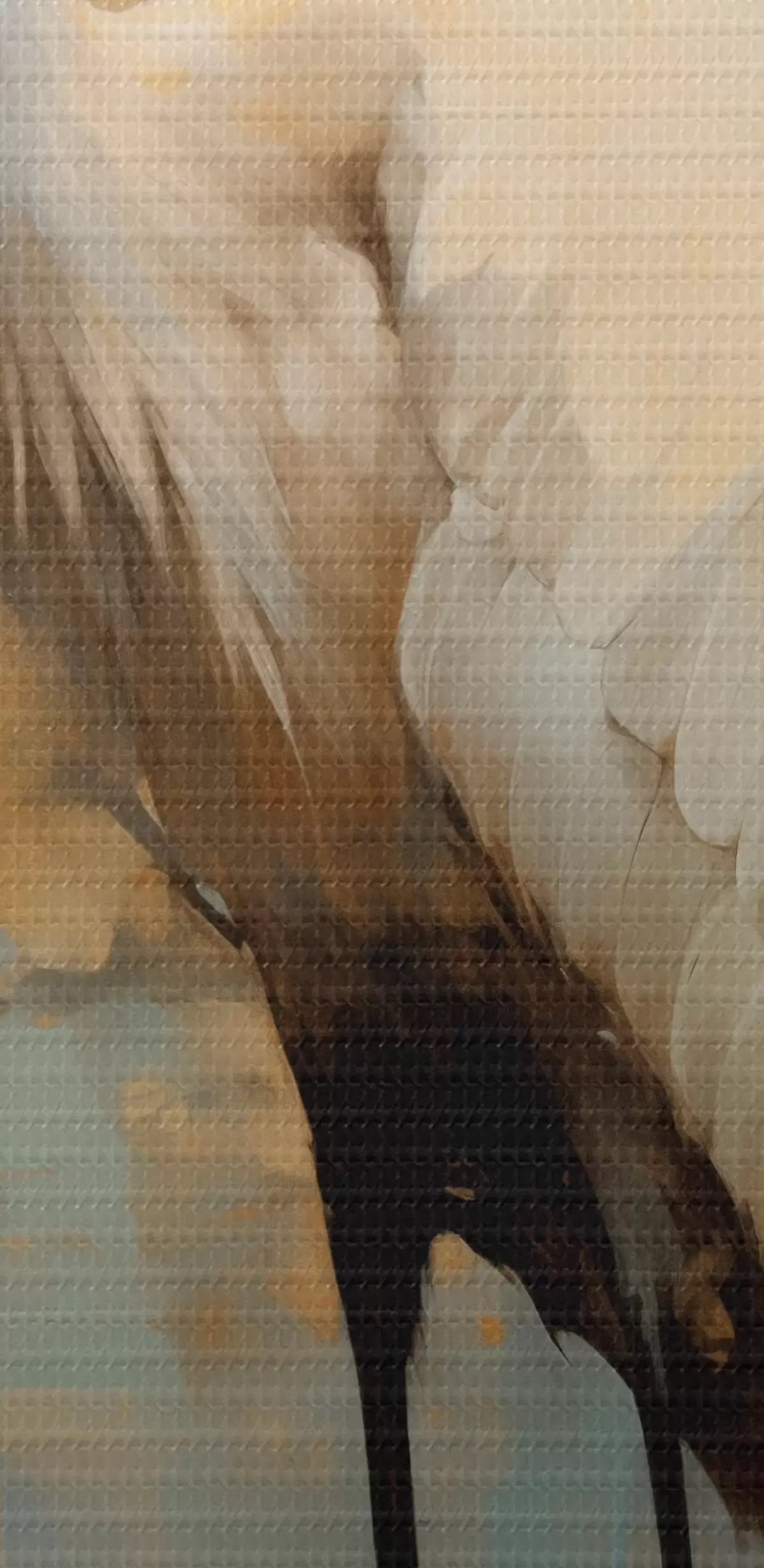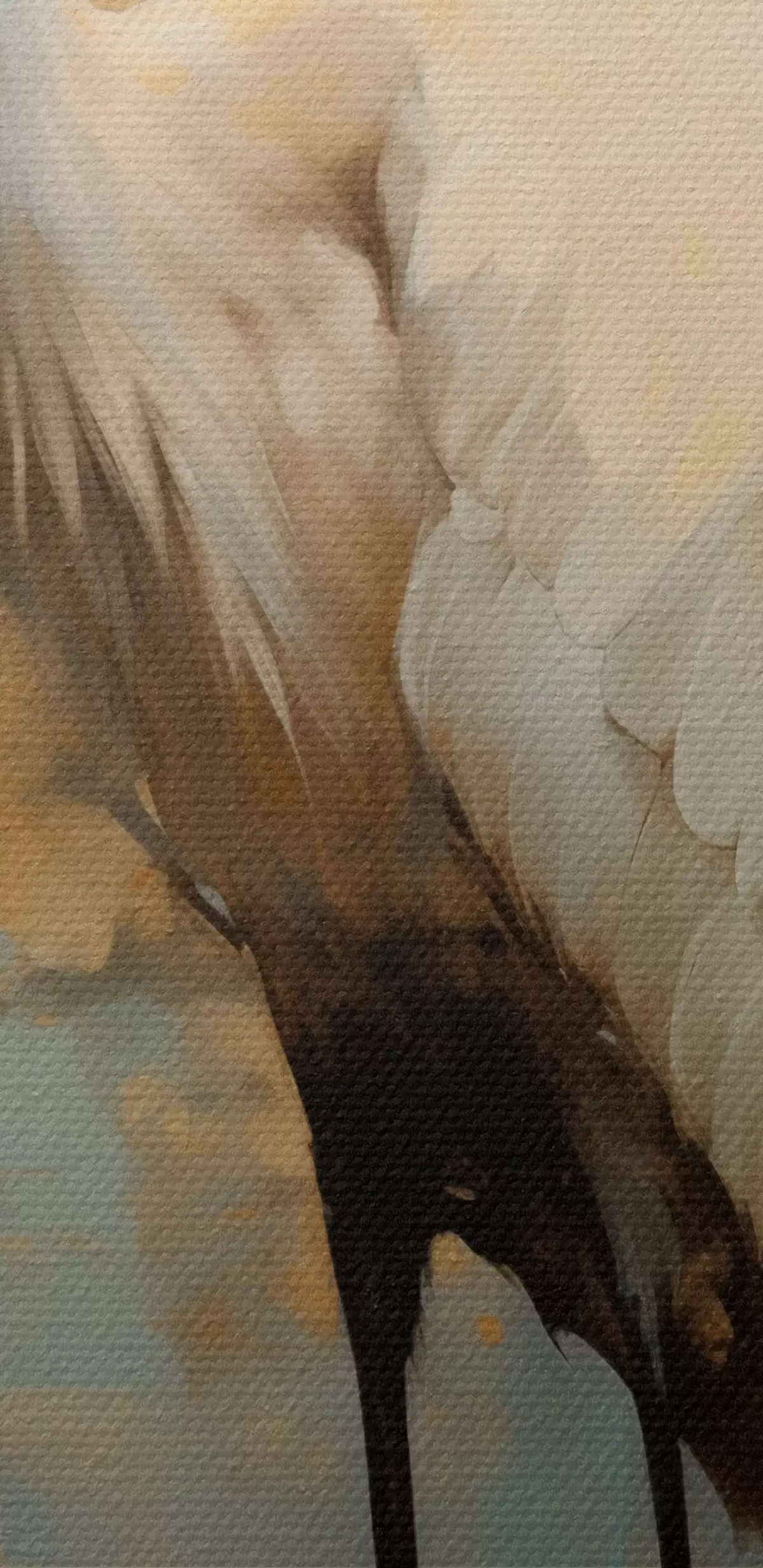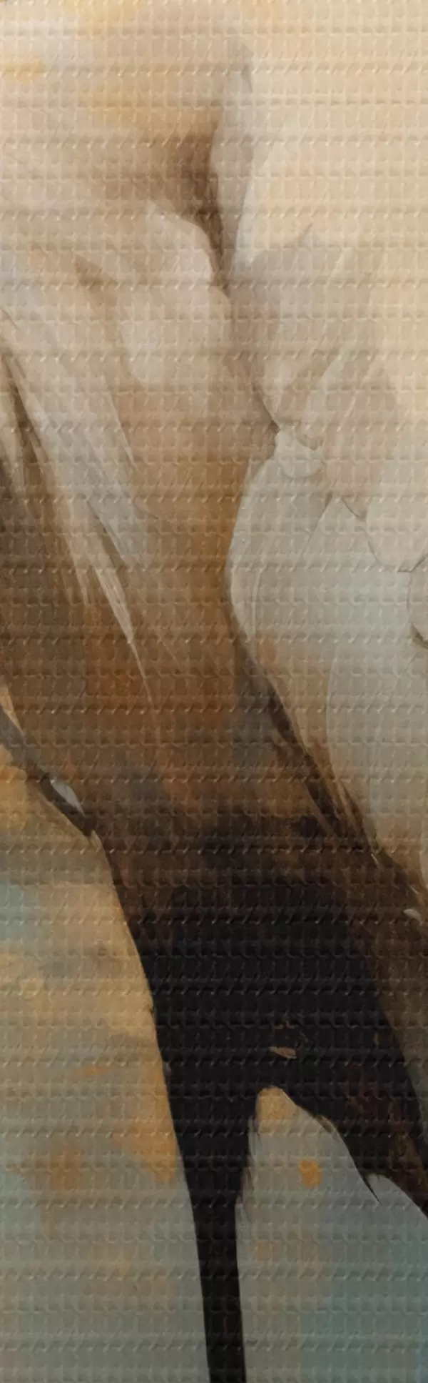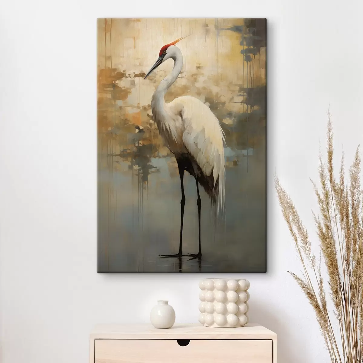 Картина Біла чапля на тлі приглушених жовтих, коричневих і синіх відтінків, що нагадують туманний, абстрактний пейзаж s45192